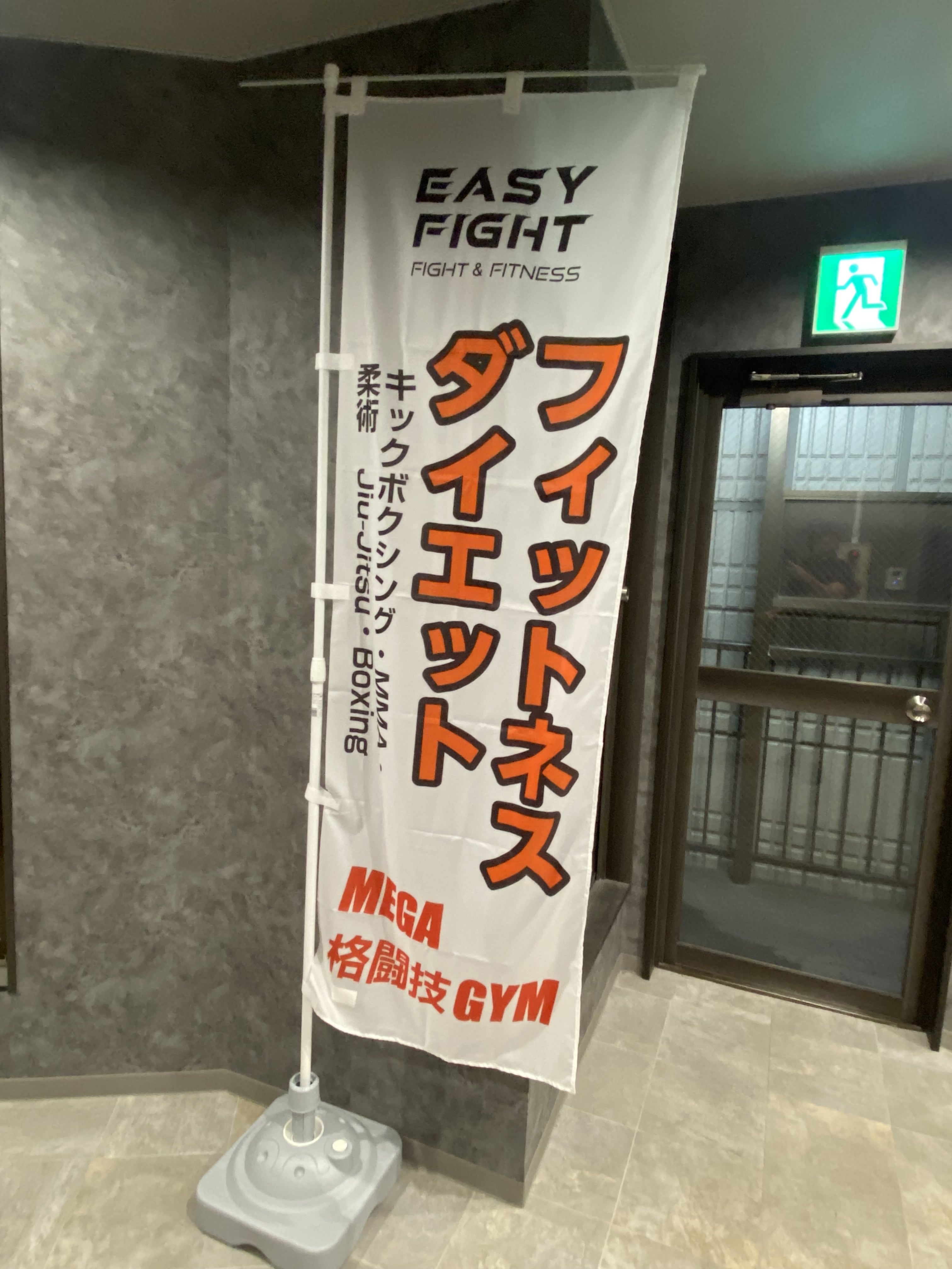 写真は、ジム前の看板と、のぼり(写真は室内ですが、今後外に出して皆さんの目に見える場所でなびかせます。)です。2階のテナントなので、少しでも通りすがりの方々に知ってもらえるよう頑張ります!