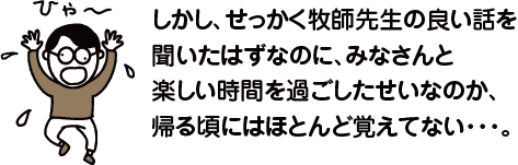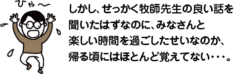 牧師先生のメッセージ礼拝など参加したことなかったので、とても新鮮な体験でした。ギター演奏しながら賛美歌を歌い、「使徒信条」というのを声に出して読んで、牧師先生が聖書の内容をわかりやすく語ってくれます。今日のメッセージが終わったら、みんなで「主の祈り」を声を出して読んで、最後は牧師先生による祝祷(参加者の為にお祈り)で1時間の礼拝は終了です。
