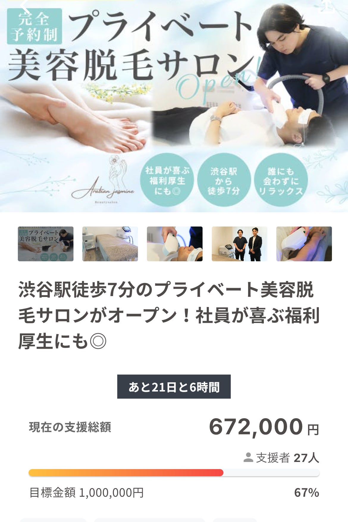 9/30をもちまして、クラウドファンディングを終了いたしました。みなさんのあたたかい応援・ご支援のおかげで、目標金額を達成することができました。本当に、本当にありがとうございます!みなさまからのご支援をいただく期間は終了しましたが、プロジェクトとしてはここがあくまでスタートラインであり、メンバー一同、今後も気を引き締めて取り組んでいきたいと思います。リターンについて支援の際に選択いただいたリターンについて、準備の方を進めてまいります。詳細につきましては主にメールにてご連絡させていただきます。リターンの到着まで楽しみにお待ちいただけると嬉しいです。これからについてサロンの様子や近況は今後Instagramを中心に更新していきます。本文末尾のリンクからご覧いただけると嬉しいです。重ねてにはなりますが、この度は応援・ご支援いただき誠にありがとうございました。今後もArabian jasmineを何卒よろしくお願いいたします。株式会社AXLife 代表取締役 赤澤祐太*━*━*━*━*━*━*━━*━━*━━*━━●Instagramhttps://www.instagram.com/a_jasmine.shibuya/?igsh=MWQyamZlbGo3a2VqZA%3D%3D*━*━*━*━*━*━*━━*━━*━━*━━