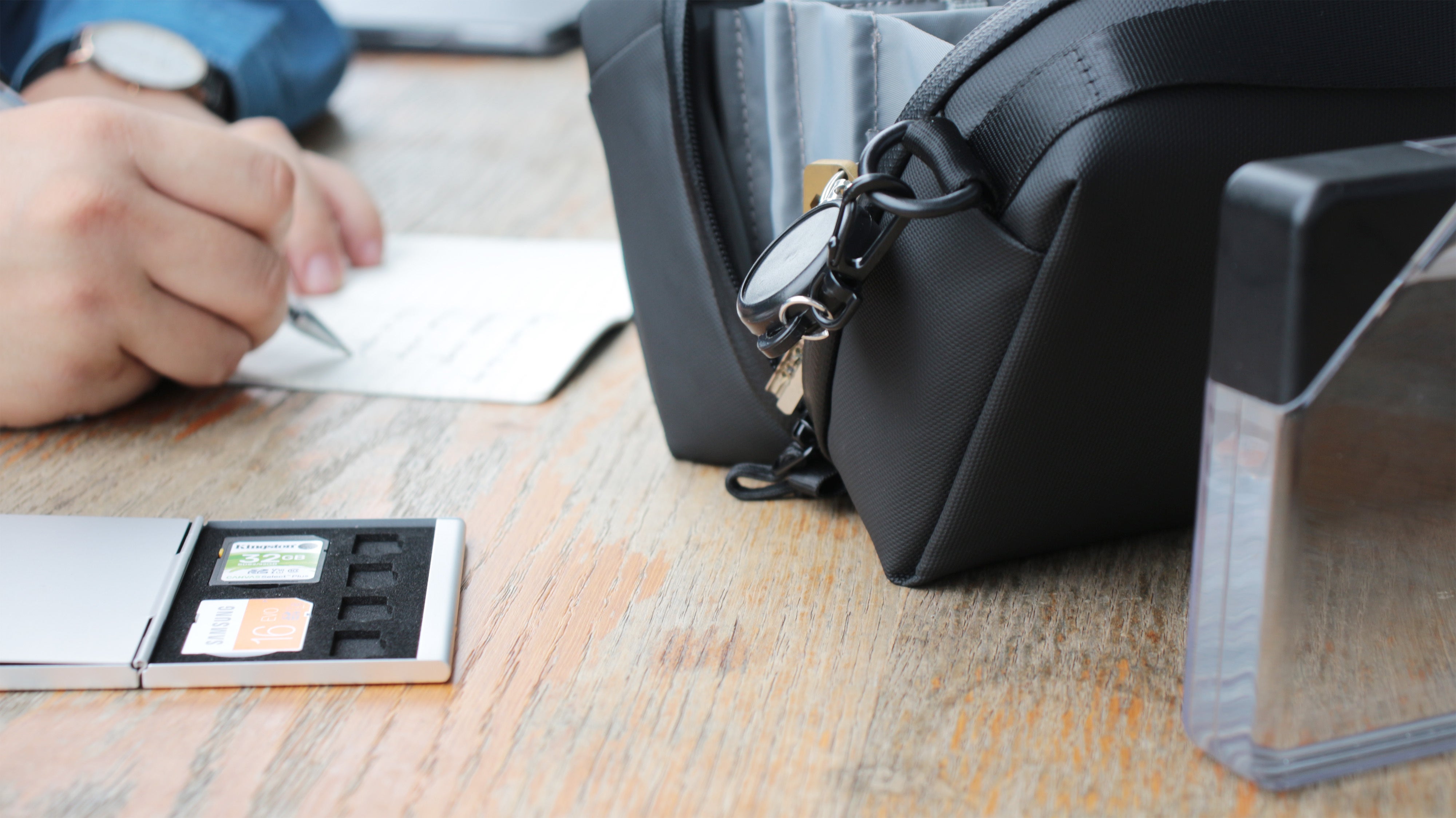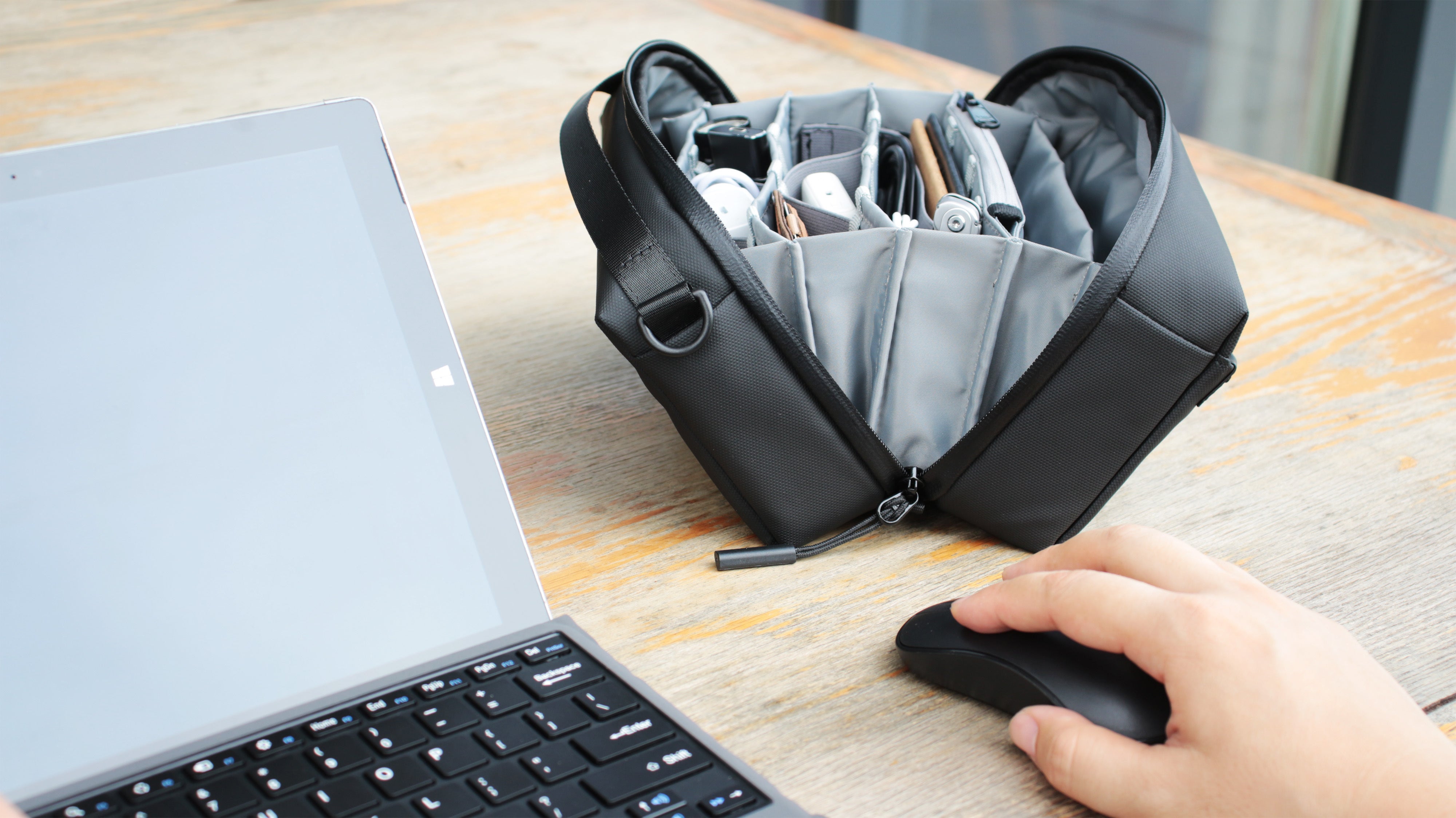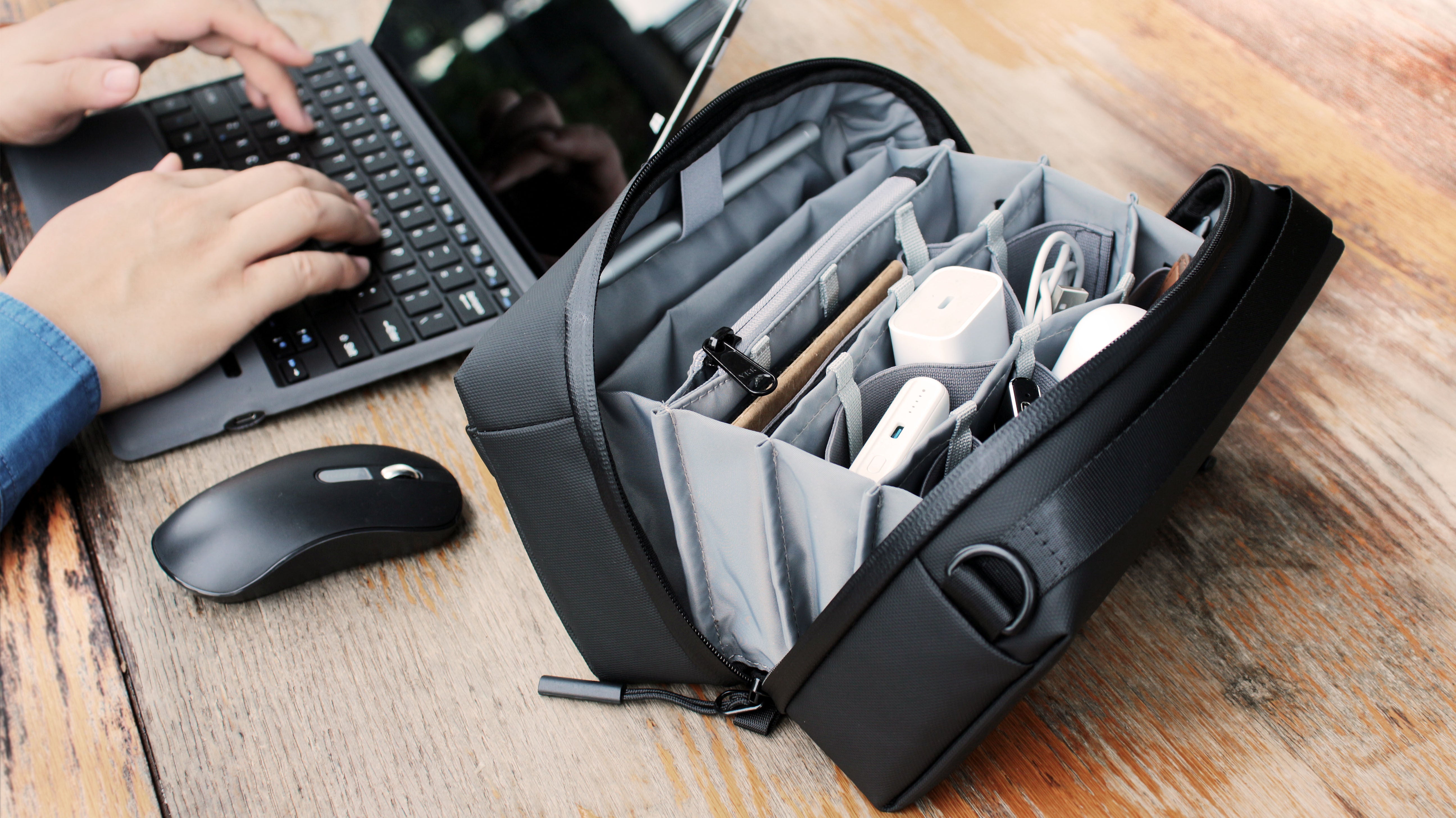 Alex T1テックポーチは超コンパクト。机の上に置いても邪魔にならず、必要なときに必要なものがスッと取り出せます。