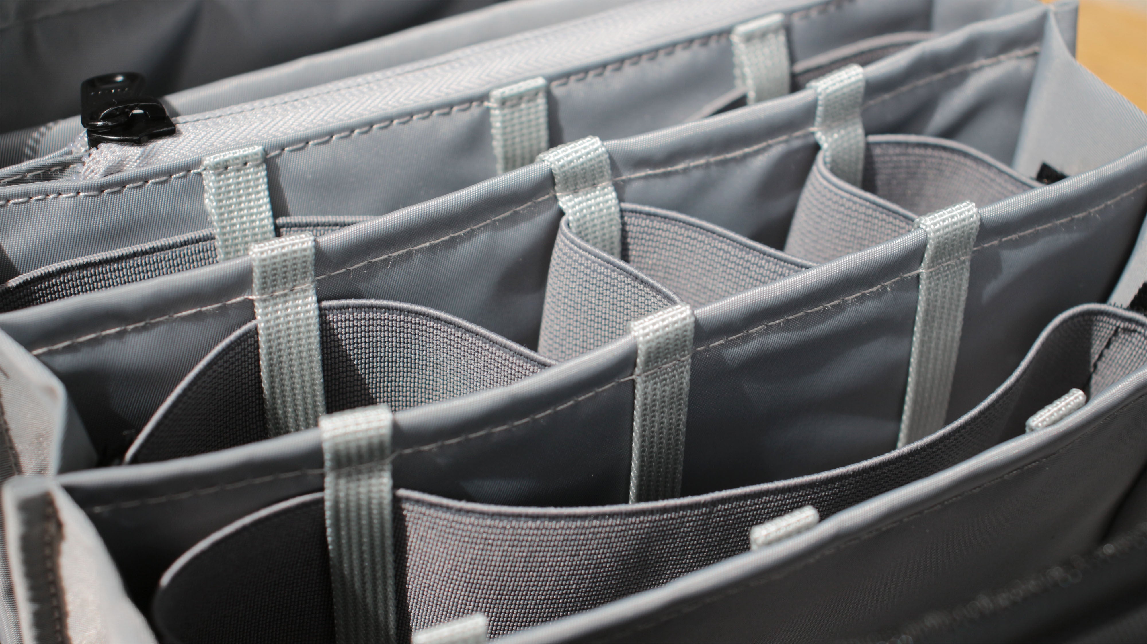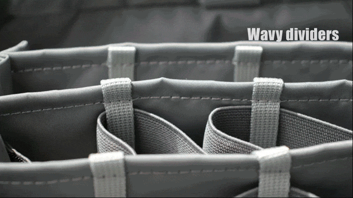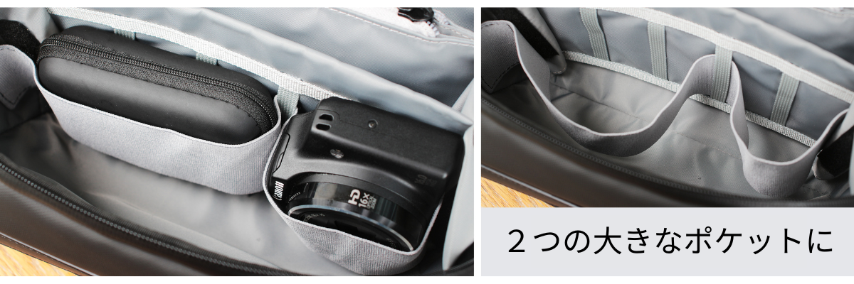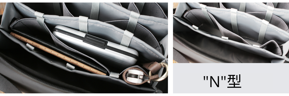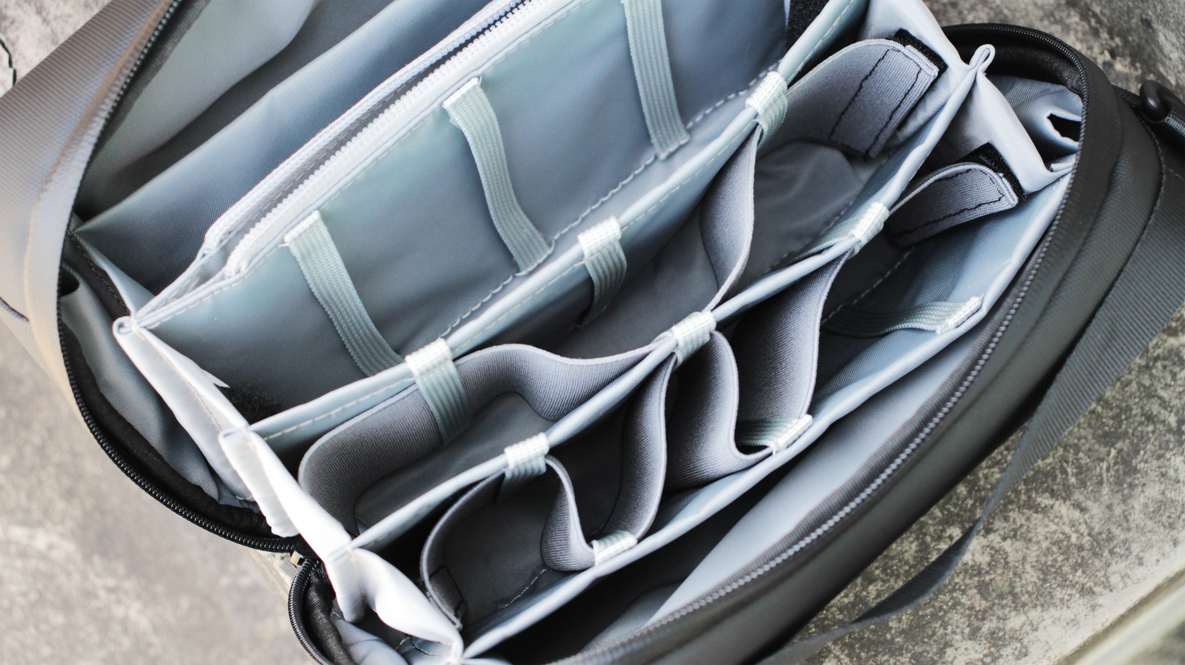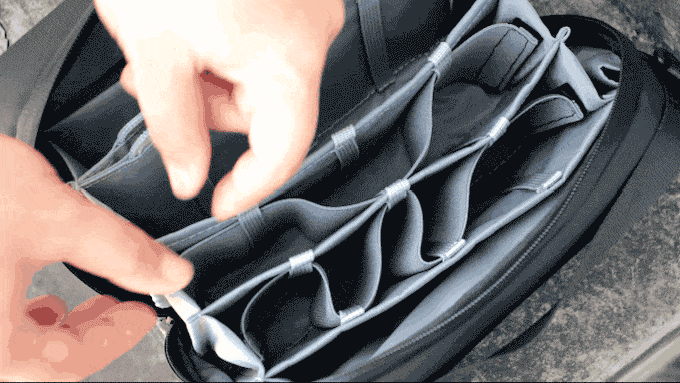 さらに大きめの荷物を収納したい場合は、仕切りを取り外すことができます。サイドのベルクロを取り外し、仕切りのゴムバンドをループから引き抜くだけ。