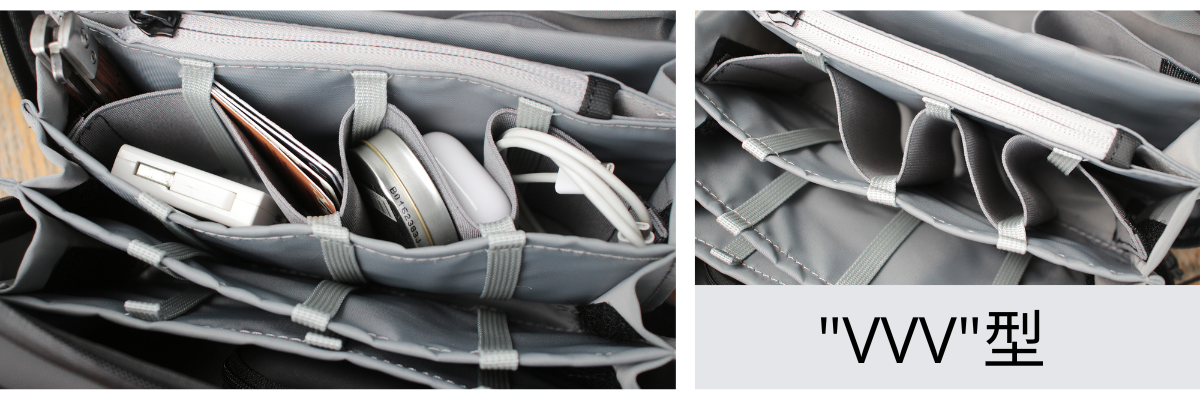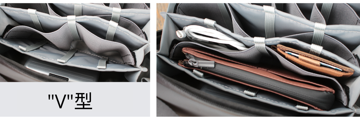 V型は、財布や小さなノート、太めのケーブルなど、比較的大きなものを収納するのに便利。