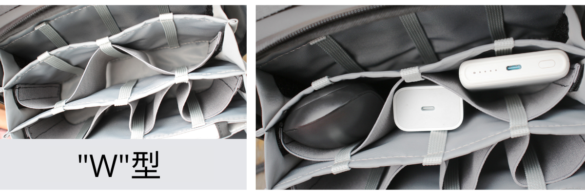 W型は、ミドルサイズのアイテム、例えば、アダプター・ワイヤレスマウス・充電器などを収納するのに最適。