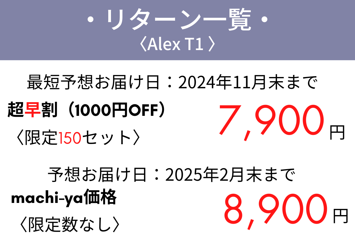 machi-ya特別価格をご用意。全ての付属品がついたAlex T1、先着150個に限り7,900円。また、150個までは在庫を保有しているため、リターン配送日は2024年11月末頃を予定しております。