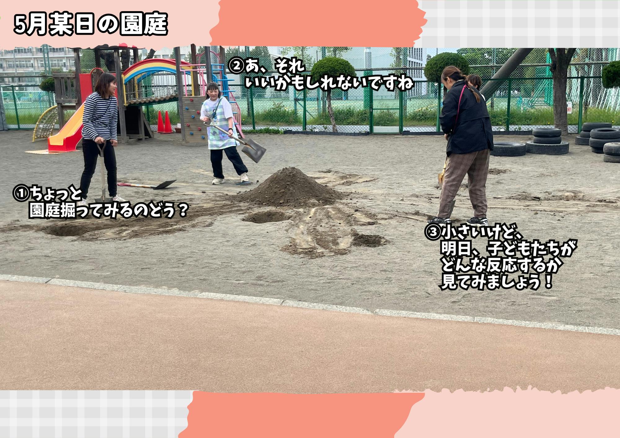 これは後に、色々な方から「え、園庭って掘っていいんですか?」「園庭掘っちゃうんだ…」と波紋を呼びましたが…結果は大成功!真っ平な園庭にできた、ほんの小さな山は、子どもたちの遊びに大きなインパクトと与えました。