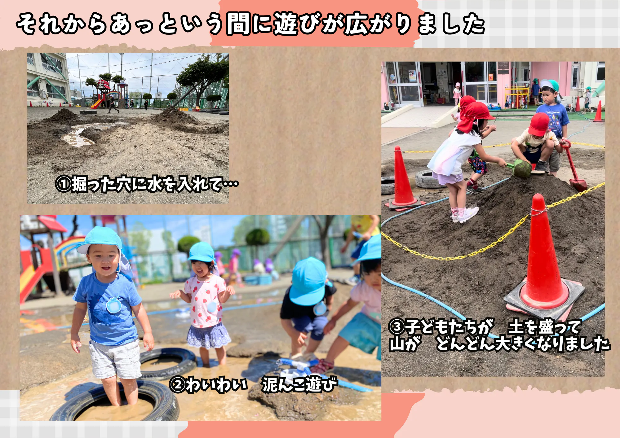 これは後に、色々な方から「え、園庭って掘っていいんですか?」「園庭掘っちゃうんだ…」と波紋を呼びましたが…結果は大成功!真っ平な園庭にできた、ほんの小さな山は、子どもたちの遊びに大きなインパクトと与えました。