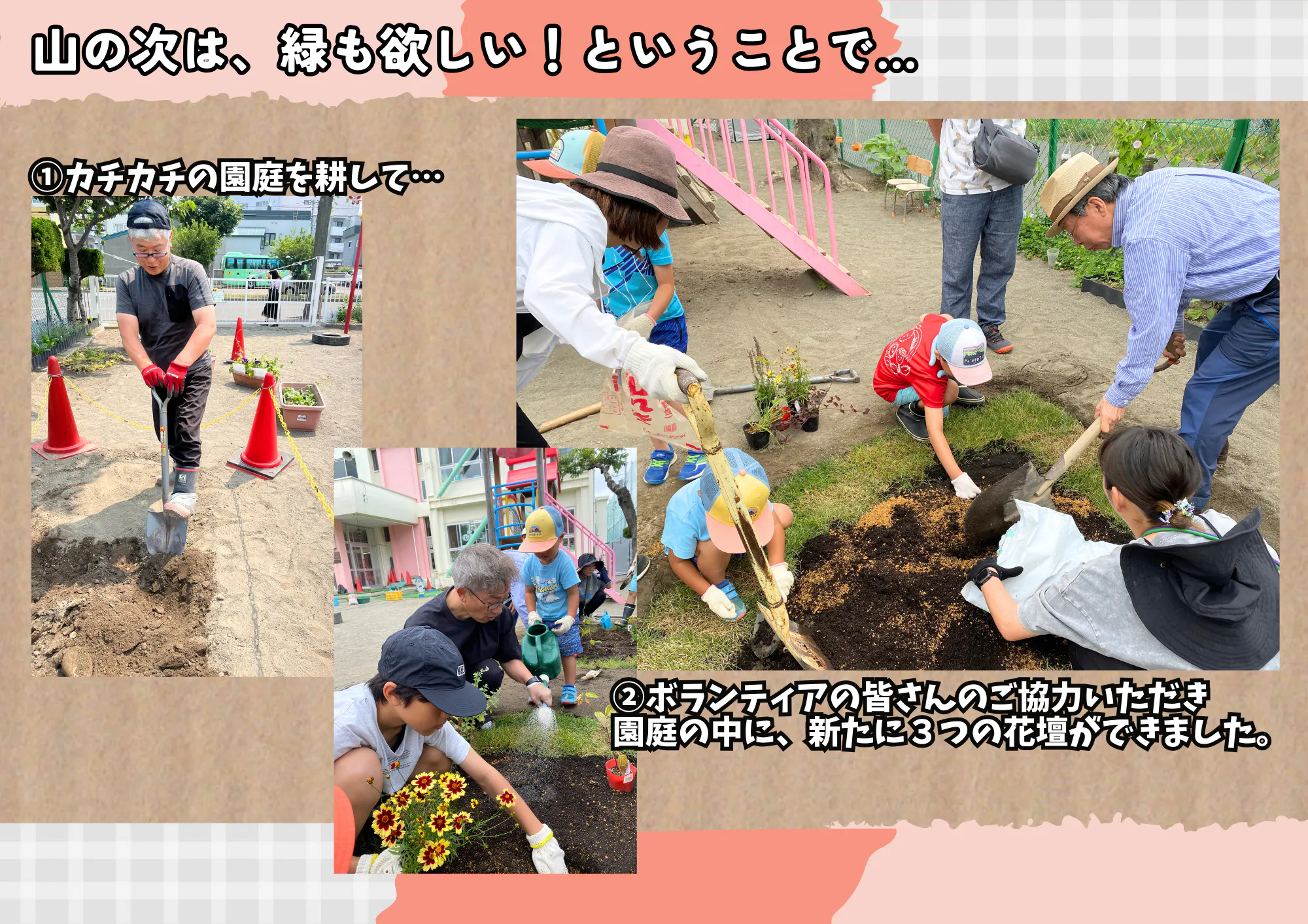 花壇の土作りと植栽を植える作業は保護者、卒園児、地域の方にボランティアをお願いしました。皆さんの協力のおかげで園庭の中に3つの花壇が出来上がりました。