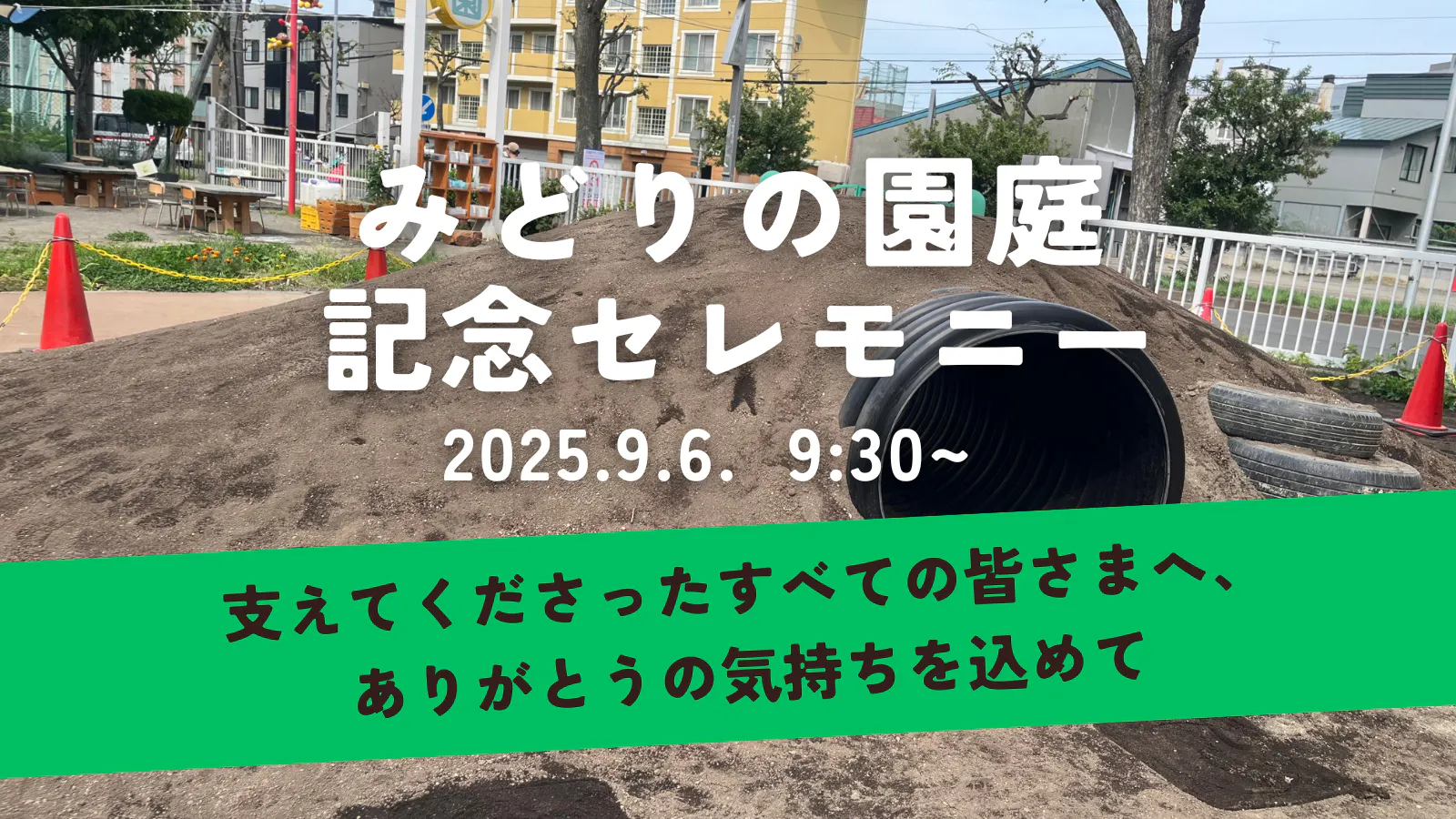 2025/08/21 18:00みどりの園庭 記念セレモニーのご案内皆さまのあたたかいご支援のおかげで、「みどりの園庭」の築山とネームプレートがついに完成しました!そこで、ご支援くださった皆さまと一緒に、完成をお祝いする記念セレモニーを開催いたします。日 時:9月6日(土) 9:30〜場 所:札幌第一幼稚園 園庭セレモニーでは、完成した築山やトンネルを見学いただいた後、築山のネームプレートづくりや、園庭のシンボルとなる記念樹の植樹も体験していただけます。支援者の皆さまと一緒に、園庭に新しい思い出を刻む特別な時間を楽しめれば嬉しいです。 お申し込み:参加希望の方は、下記フォームよりお申し込みください。[参加申込フォームリンク]https://forms.gle/REaiWFpvqrqLpUJU6 もっと見る
