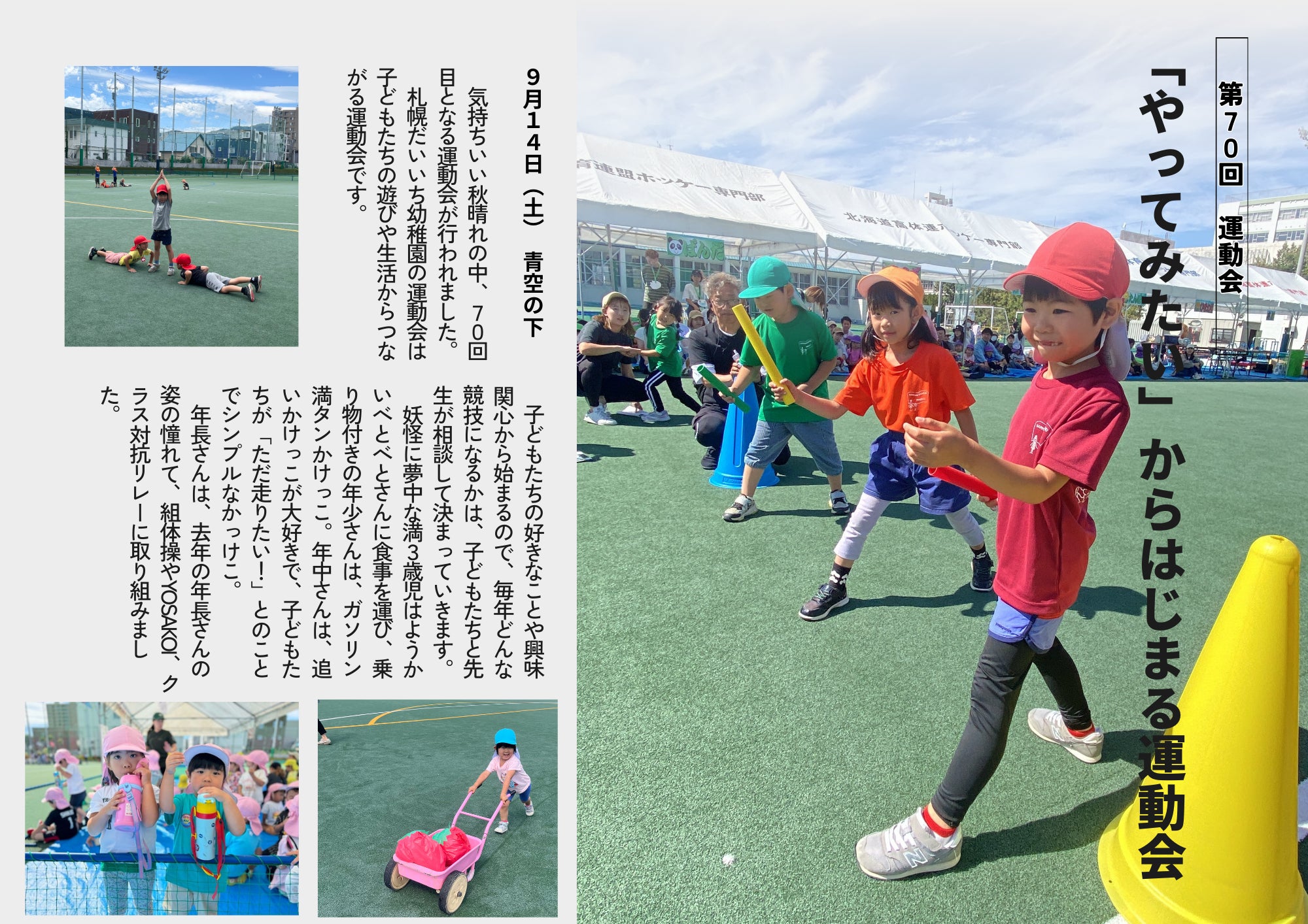札幌だいいち幼稚園では、行事は普段の遊びや生活・活動の延長線上の一部と考え、運動会においても「子どもたちのやってみたい」を競技や演目に取り入れています。