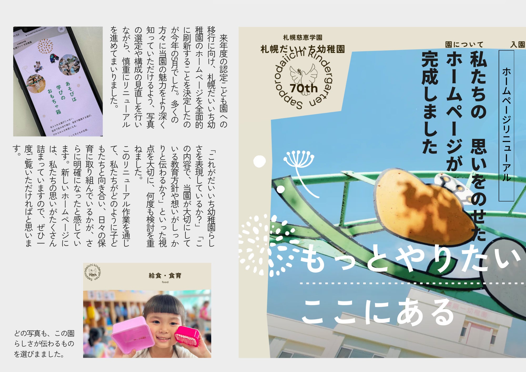 来年度の認定こども園への移行に向け、札幌だいいち幼稚園のホームページを全面的に刷新することを決定したのが今年の5月でした。多くの方々に当園の魅力をより深く知っていただけるよう、写真の選定や構成の見直しを行いながら、慎重にリニューアルを進めてまいりました。