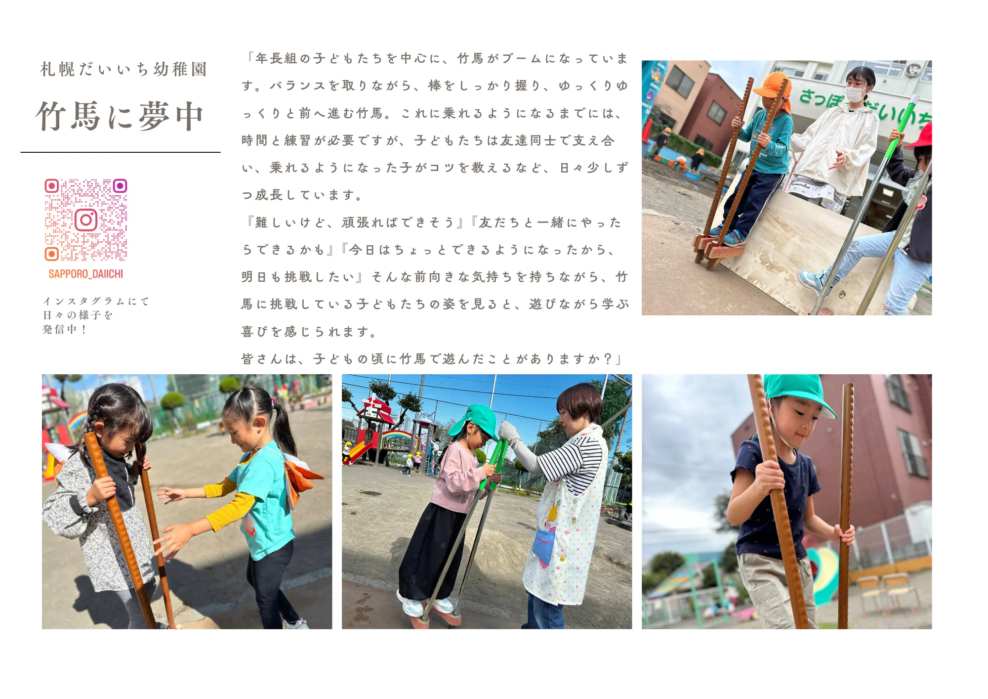 「年長組の子どもたちを中心に、竹馬がブームになっています。バランスを取りながら、棒をしっかり握り、ゆっくりゆっくりと前へ進む竹馬。これに乗れるようになるまでには、時間と練習が必要ですが、子どもたちは友達同士で支え合い、乗れるようになった子がコツを教えるなど、日々少しずつ成長しています。