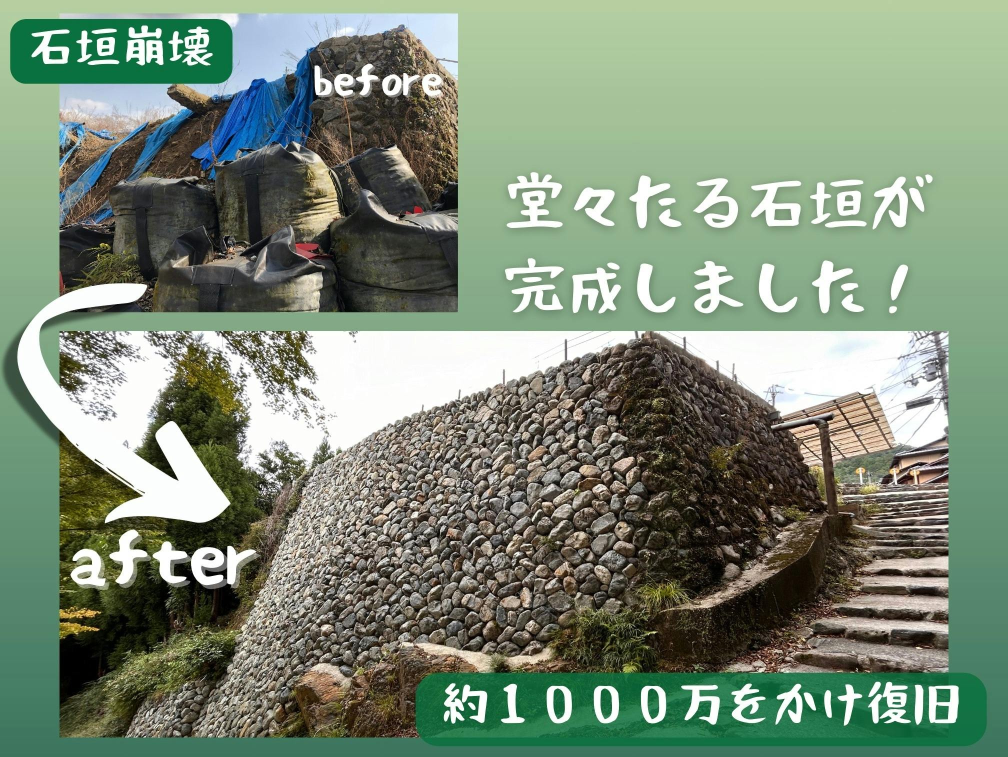 石垣は、神護寺に続く参道を半分塞ぐように崩れていたため、早急に復旧する必要があり、父が約1000万をかけて復旧しました。