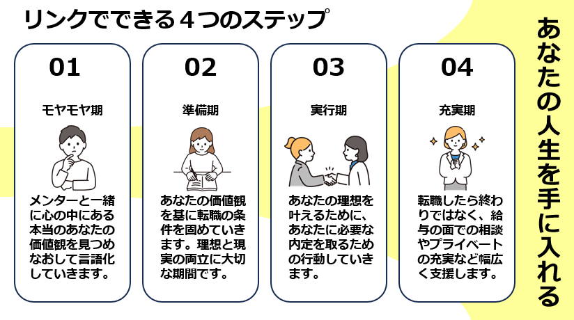 その名も、メンターと伴走しながら仕事も家庭も趣味も、全部のモヤモヤを晴らし、転職紹介も受けられる、転職支援コミュニティ「リンク」です。