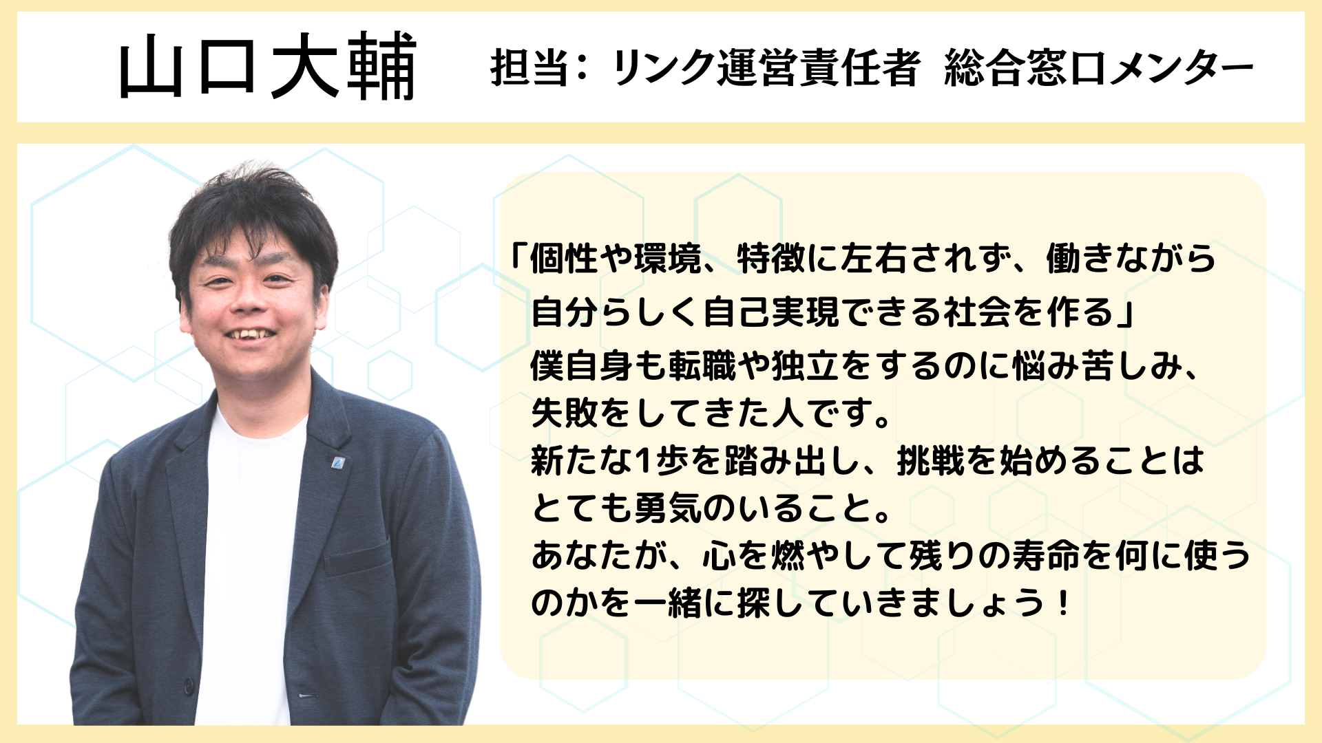 リンクに関わって頂いているメンターの方々は、独立支援のコミュニティを運営している方から、自分らしく生きていくためのサポートを長くやっている方、経営者向けのカウンセリングを行っていたり、子育ての悩み解決として保育園の園長先生、転職エージェントして大手人材会社で活躍している方、キャリアコンサルタントとして10年以上キャリア支援を行っている方まで幅広くあなたをサポートしていきます。