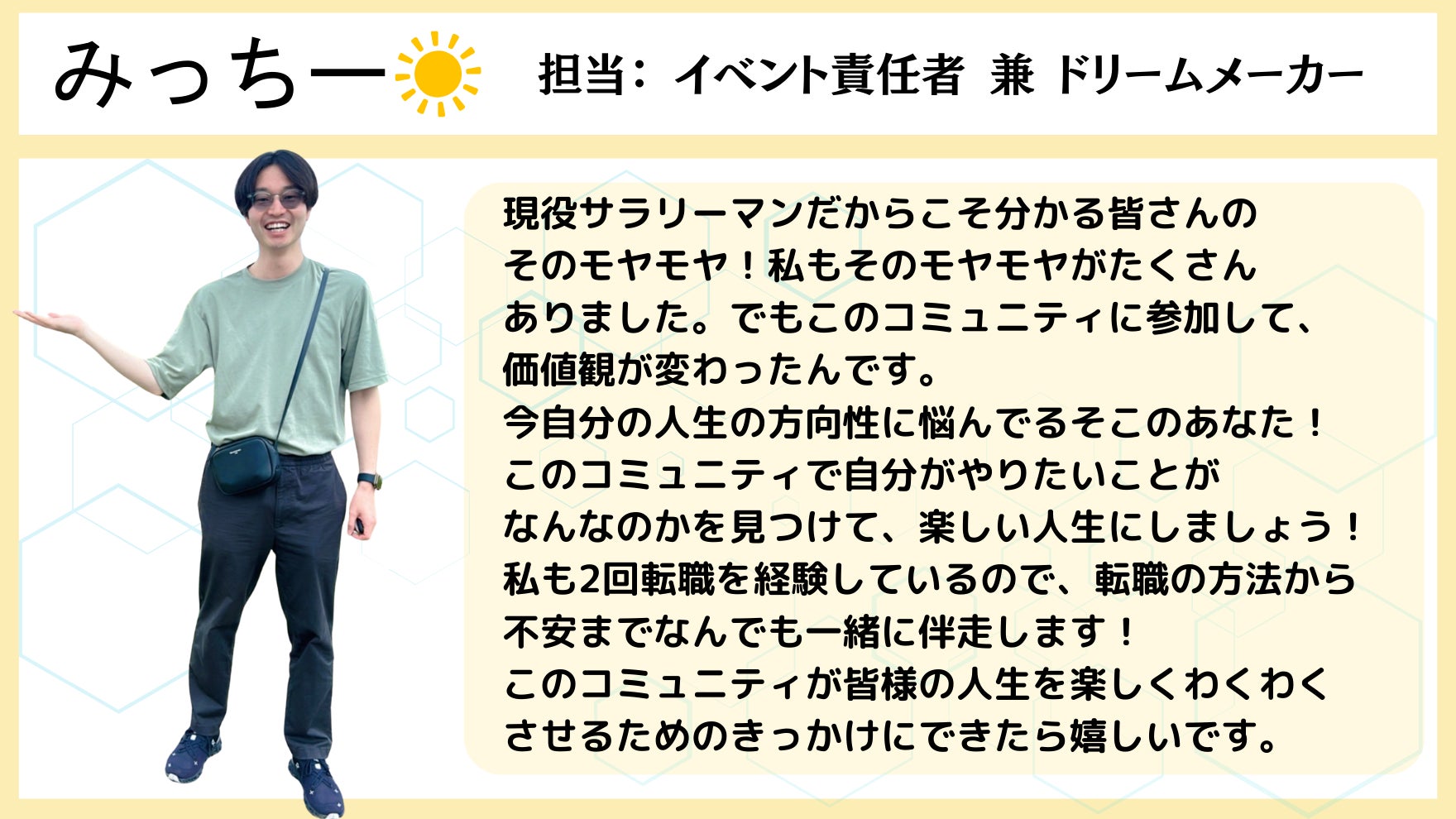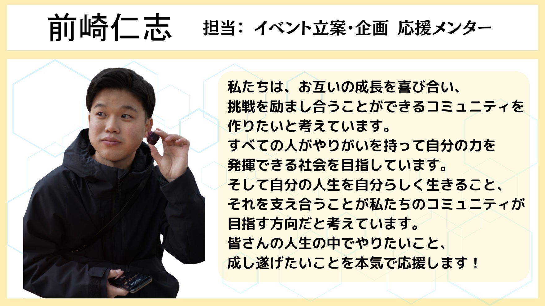 一人一人と真剣に向き合い、時にはコミュニティ参加者同士でお互いに助け合いながら、それぞれが心から求める自分の理想の人生を実現していくために、メンターと伴走しながら、一緒に人生を歩んでいきたいと考えています。