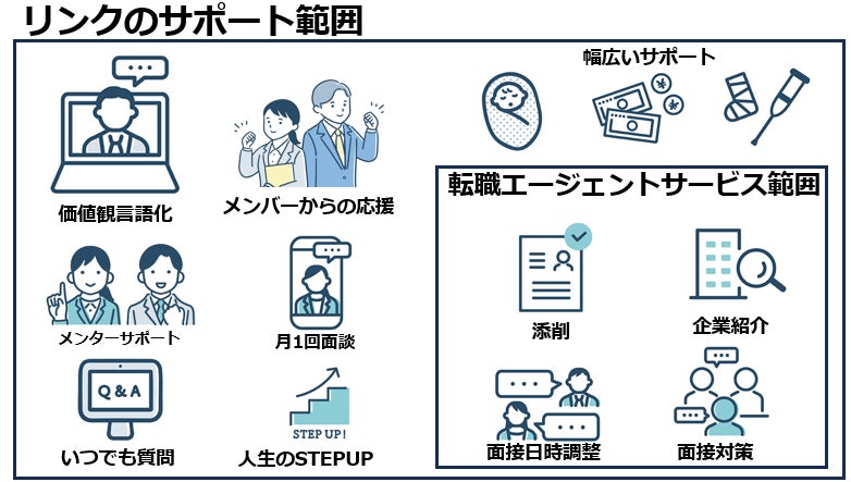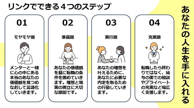 その名も、メンターと伴走しながら仕事も家庭も趣味も、全部のモヤモヤを晴らし、転職紹介も受けられる、転職支援コミュニティ「リンク」です。