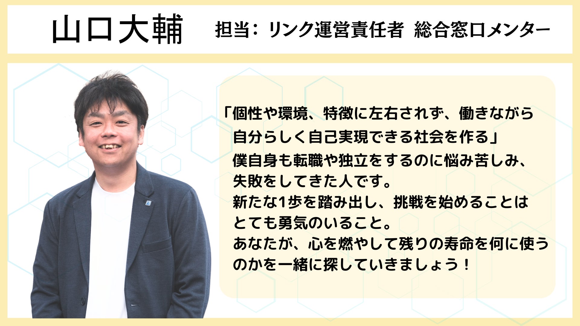 働くこととプライベートは密接に絡み合っているためリンクではどちらの悩みに対しても解決へ一歩踏み出せるように多種多様なメンターを取り揃えていきます。