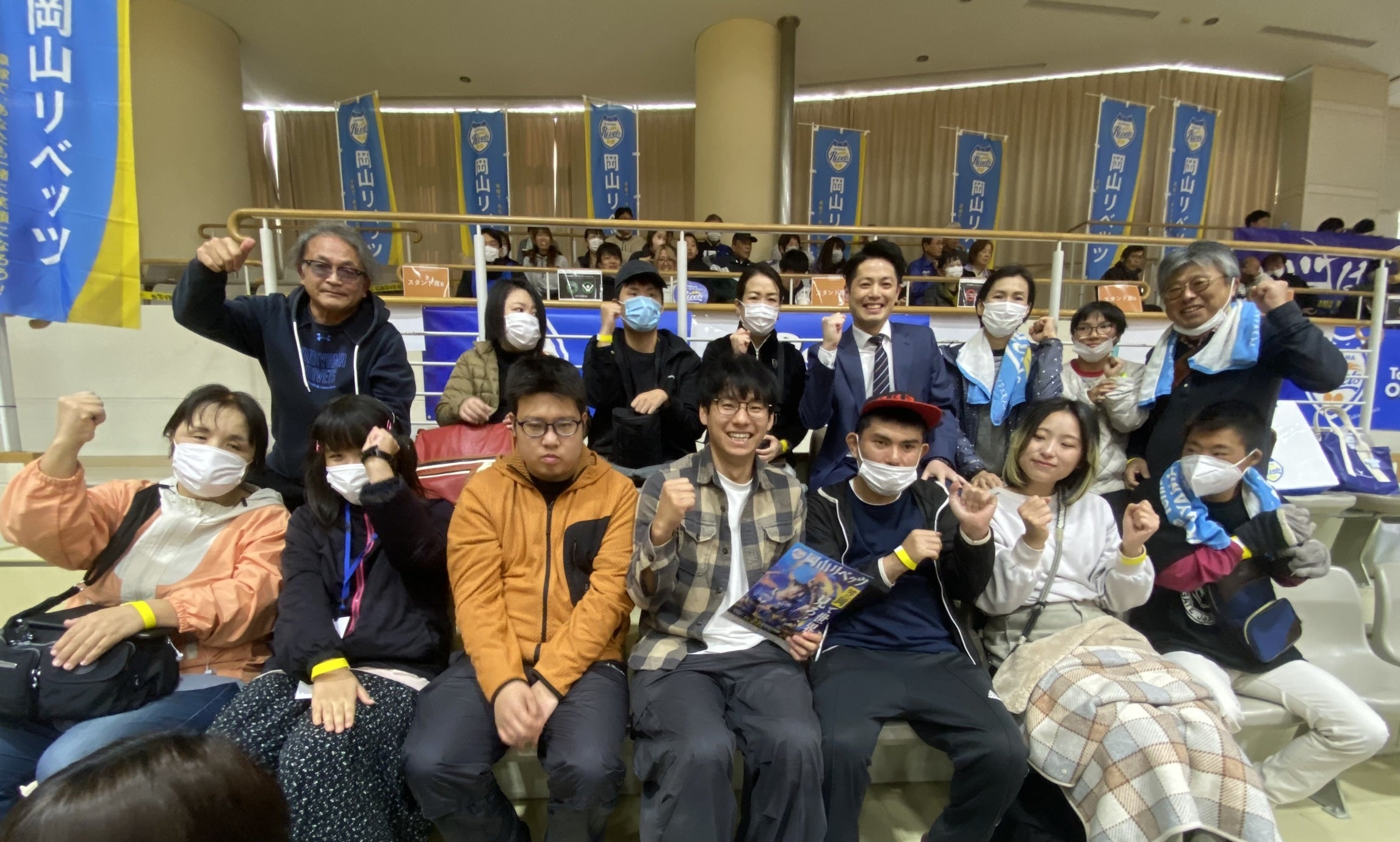 スポーツの応援は、選手の素晴らしい技術やチームワークを観る楽しさと、その応援にあると思います。特に応援は、観客がひとつになって地元のチームを応援するという楽しさがあります。障害のある子の家族にもそんな楽しみを知ってもらおうと今回の応援企画を考えました。今回の参加者も多くが卓球観戦は初めてのようで、プロの卓球の素晴らしいさを感じて頂きました。また、応援団と一緒に、「がんばれ!おかやま!」「がんばれ!リベッツ!」と大きな声で岡山リベッツを応援してもらいました。