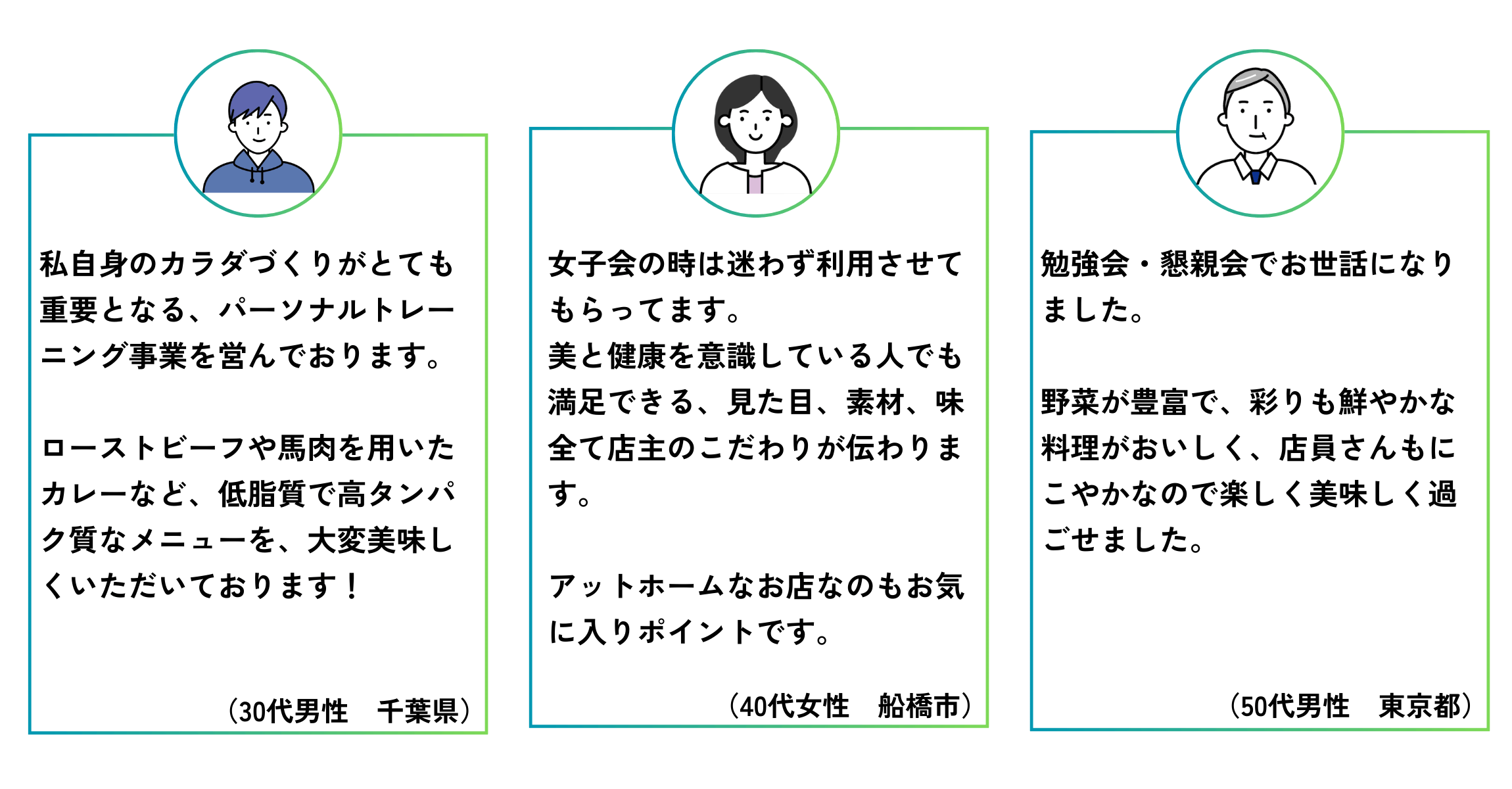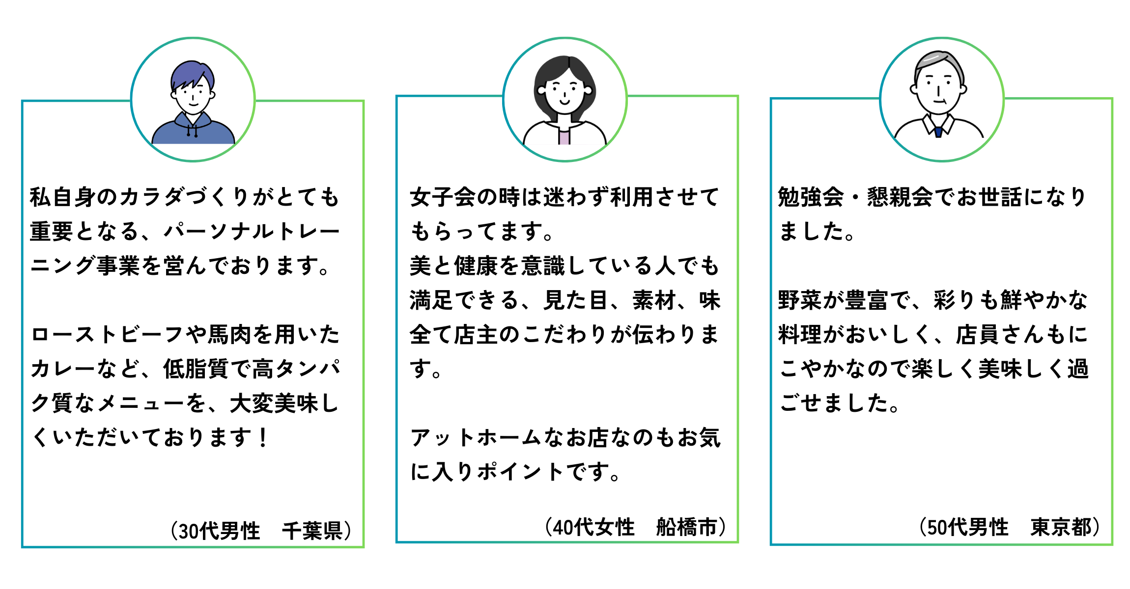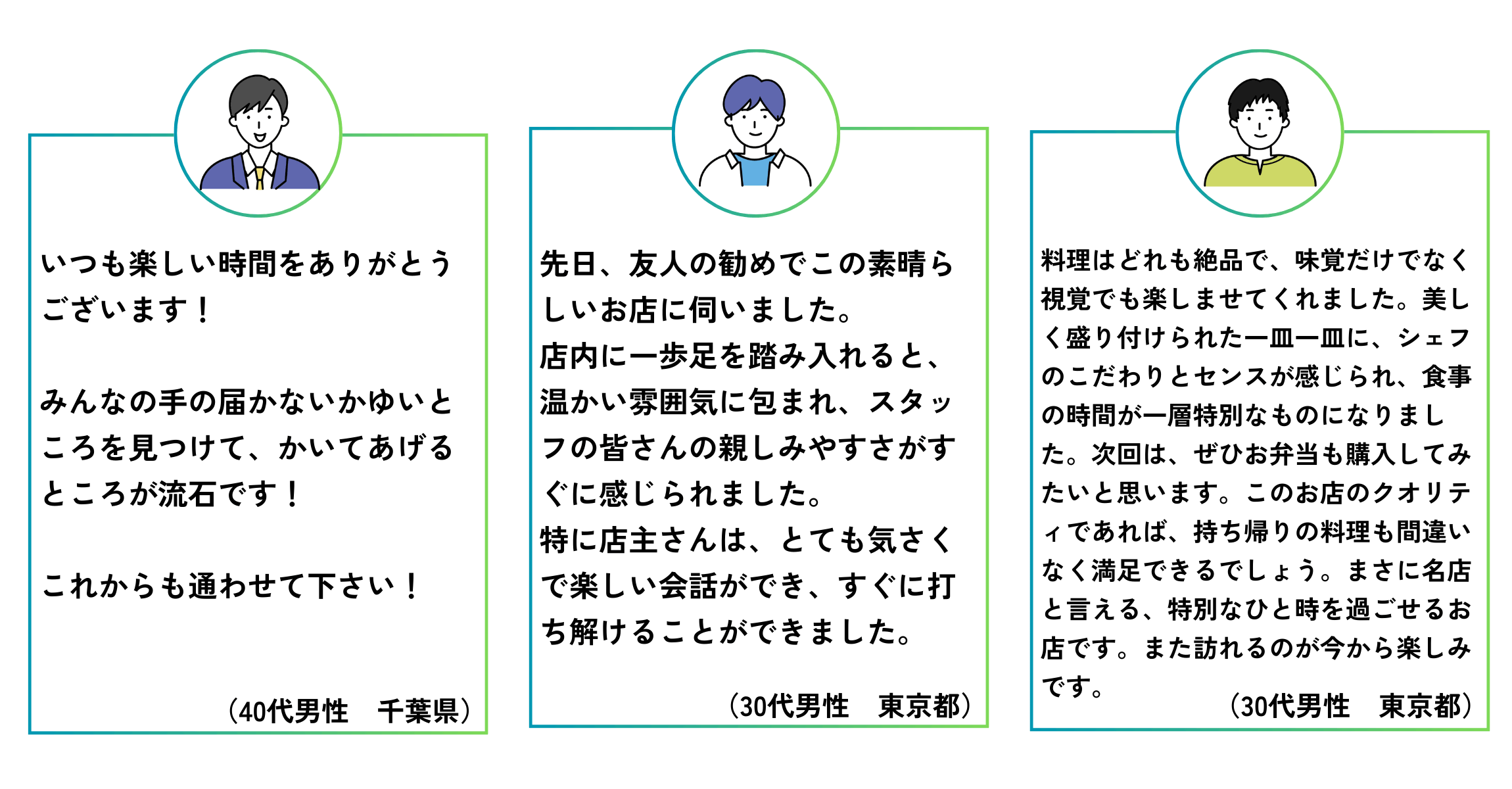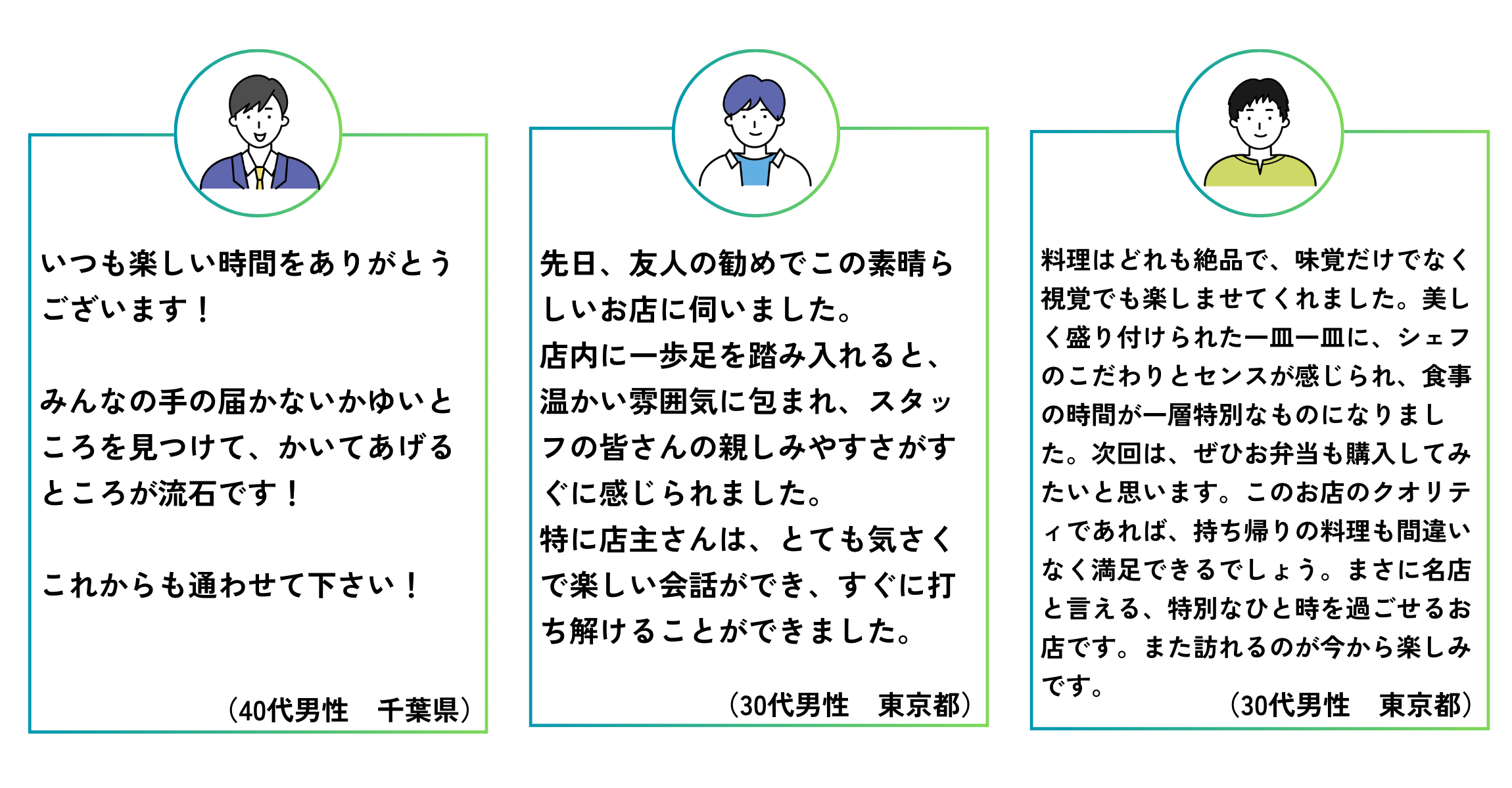 これまでたくさんの方がたに当店をご利用いただきました。インタビューにご協力いただいた皆さまの感想をご紹介いたします。当店の特徴をご理解いただけますと幸いです。