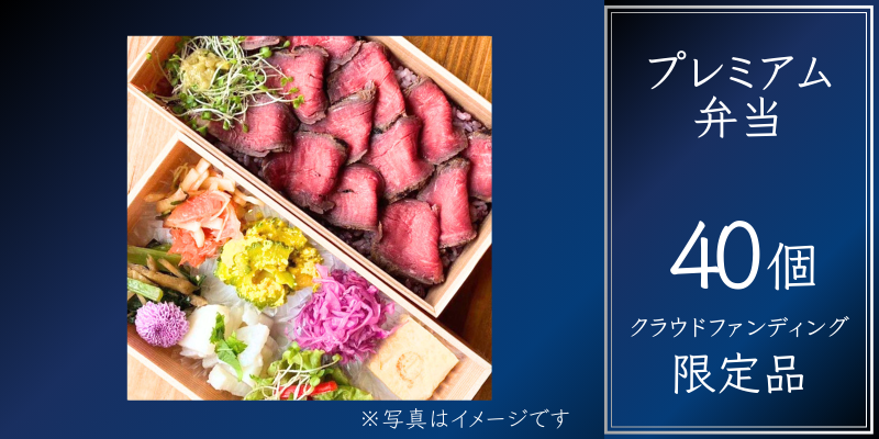 これまで予約のみで売り切れ御免だったプレミアム弁当をさらにパワーアップした「クラファン限定プレミアム弁当」を40個(40食)ご提供いたします。