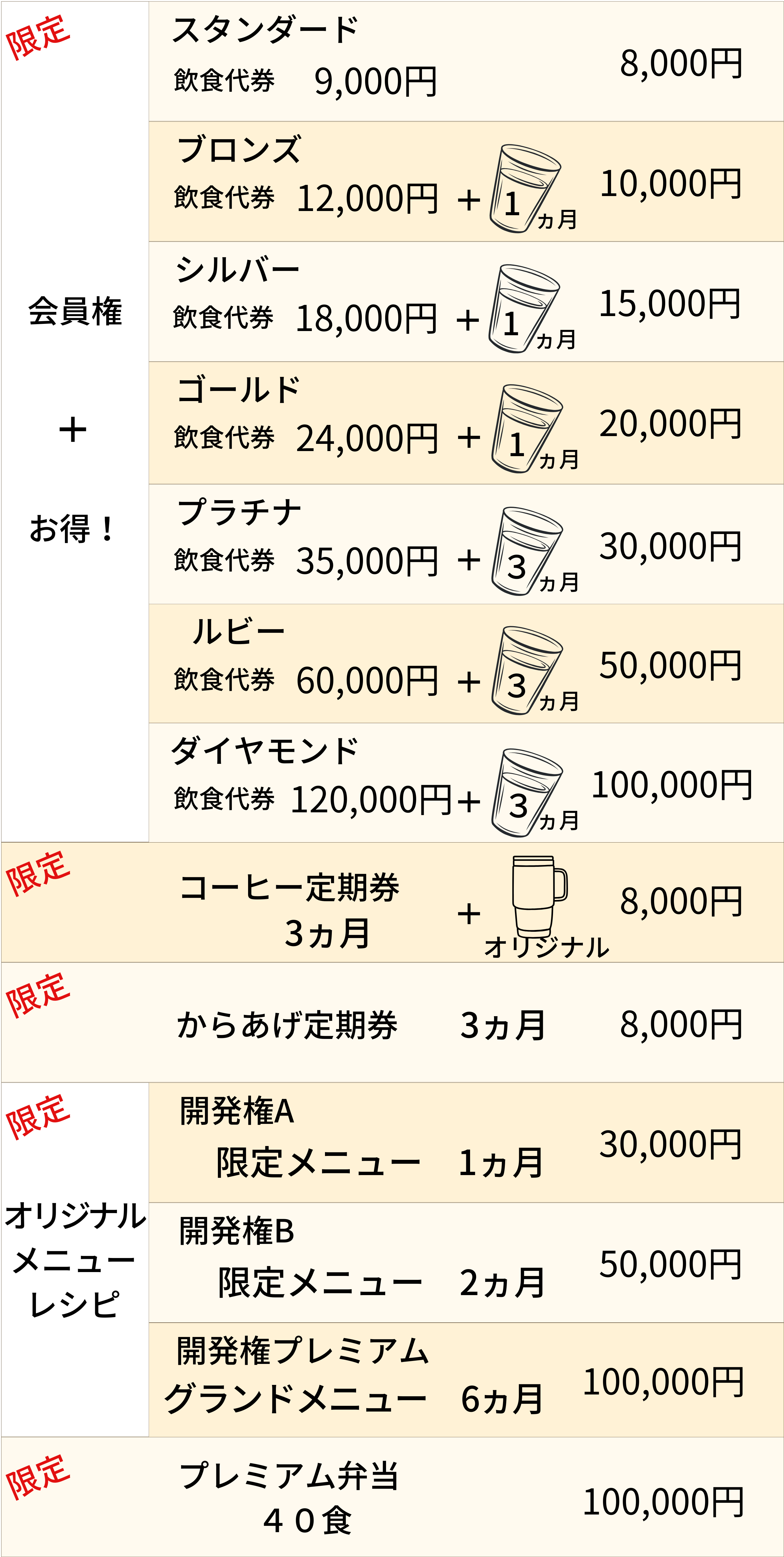 お得な会員権やからあげ定期券、限定コーヒーチケットとプレミアム弁当、オリジナルレシピ開発権をご用意しています。
