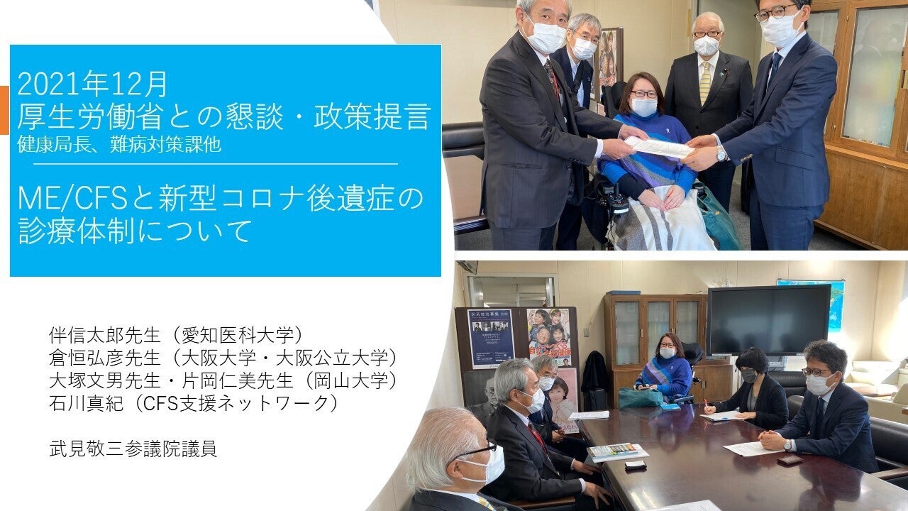また、2020年から問題になっている新型コロナウイルス後遺症患者の約10~60%がME/CFSの診断基準を満たすとの研究報告が国内外からされていることから、診療体制の構築について厚生労働省と懇談し、政策提言をしました。