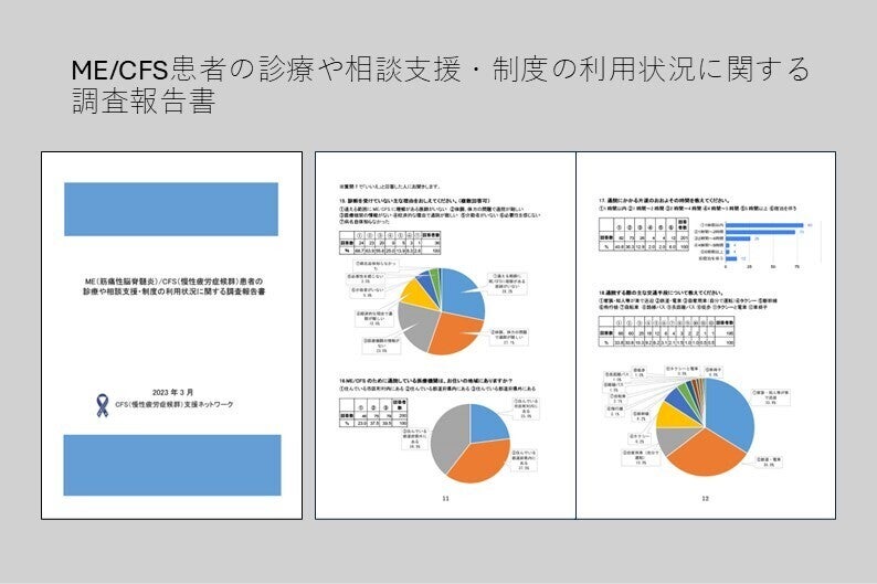 「ME/CFS患者の診療や相談支援・制度の利用状況に関する調査報告書」(A4サイズ✕36p) は、2023年に、多くのME/CFSの患者やそのご家族にご協力を頂いて行った、アンケート調査をまとめた報告書です。国や様々な支援機関等がME/CFSについてよりよく理解し、ニーズにあった支援のあり方の検討に資することを目的に、ME/CFSの「診療」や「相談」、「制度の利用状況」や「具体的な困りごと」等について調査した結果をまとめたこの報告書を全国の保健所、難病相談支援センター、厚生労働省、ご協力いただいた医療機関等に送付したところ、高い評価をいただきました。