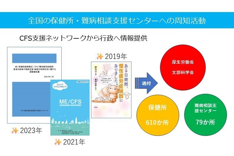 全国どこに住んでいても相談支援の手が届くように、全国すべての保健所と難病相談支援センターへ、各種資料をお届けしています。2019年には、ゆらり著『ある日突然、慢性疲労症候群になりました』、2021年に『ME/CFS療養生活の手引き』、2023年に『ME/CFS患者の診療や相談支援・制度の利用状況に関する調査報告書』を送付いたしました。
