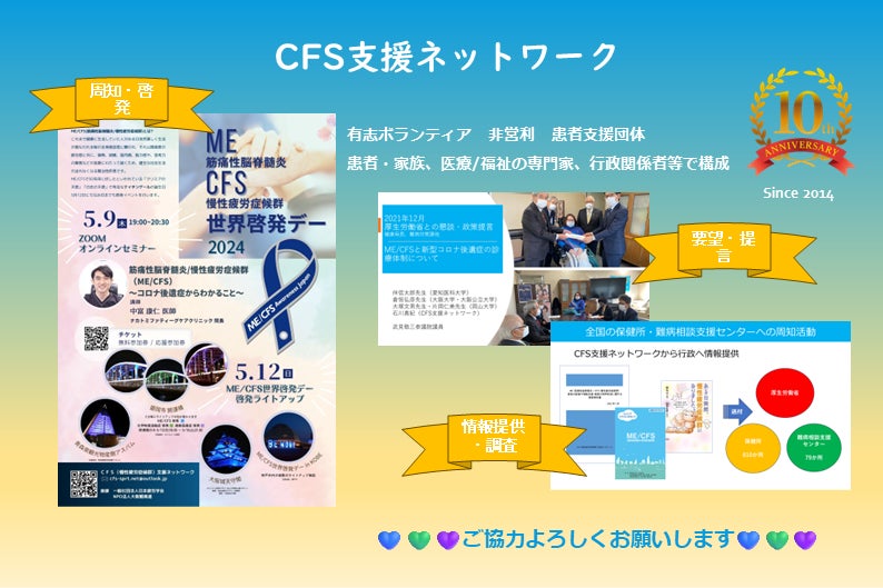 私たちは、ME(筋痛性脳脊髄炎)/CFS(慢性疲労症候群) 患者の生活の安定と向上を目的とする非営利のボランティア団体です。多くの方にご協力、ご支援いただき、今年10周年を迎えます。