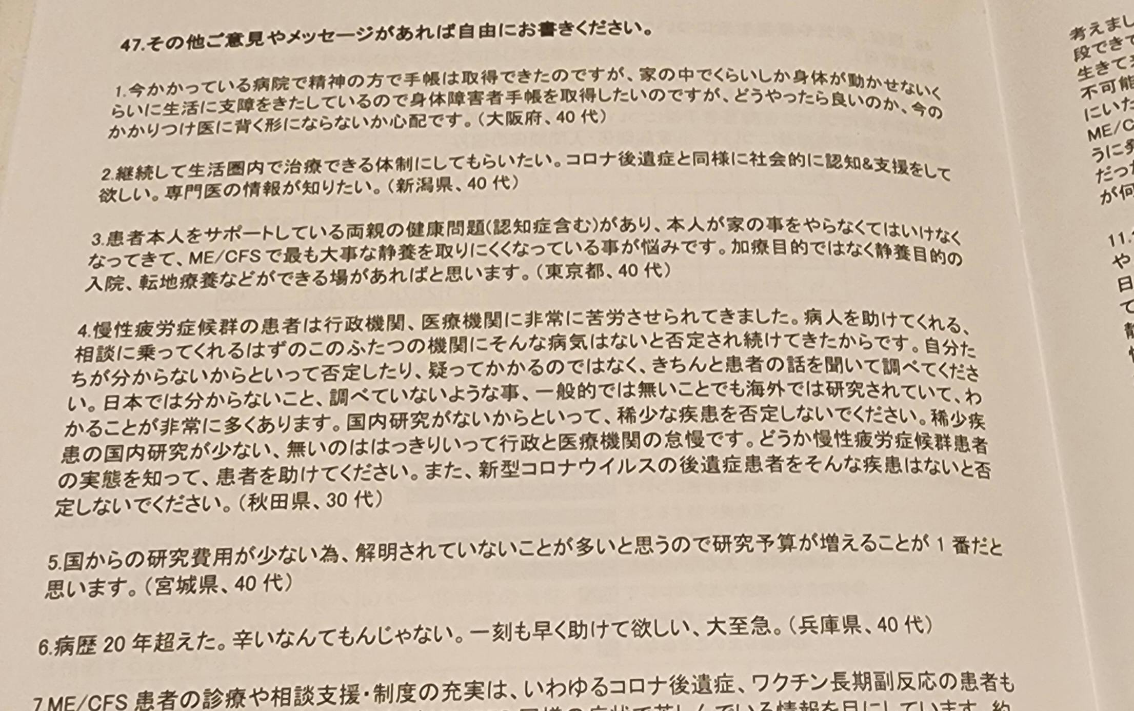 「ME/CFS患者からの相談がきているが、どのような支援ができるかわからず困っていたところ、この調査報告を読んで、よくわかりました」