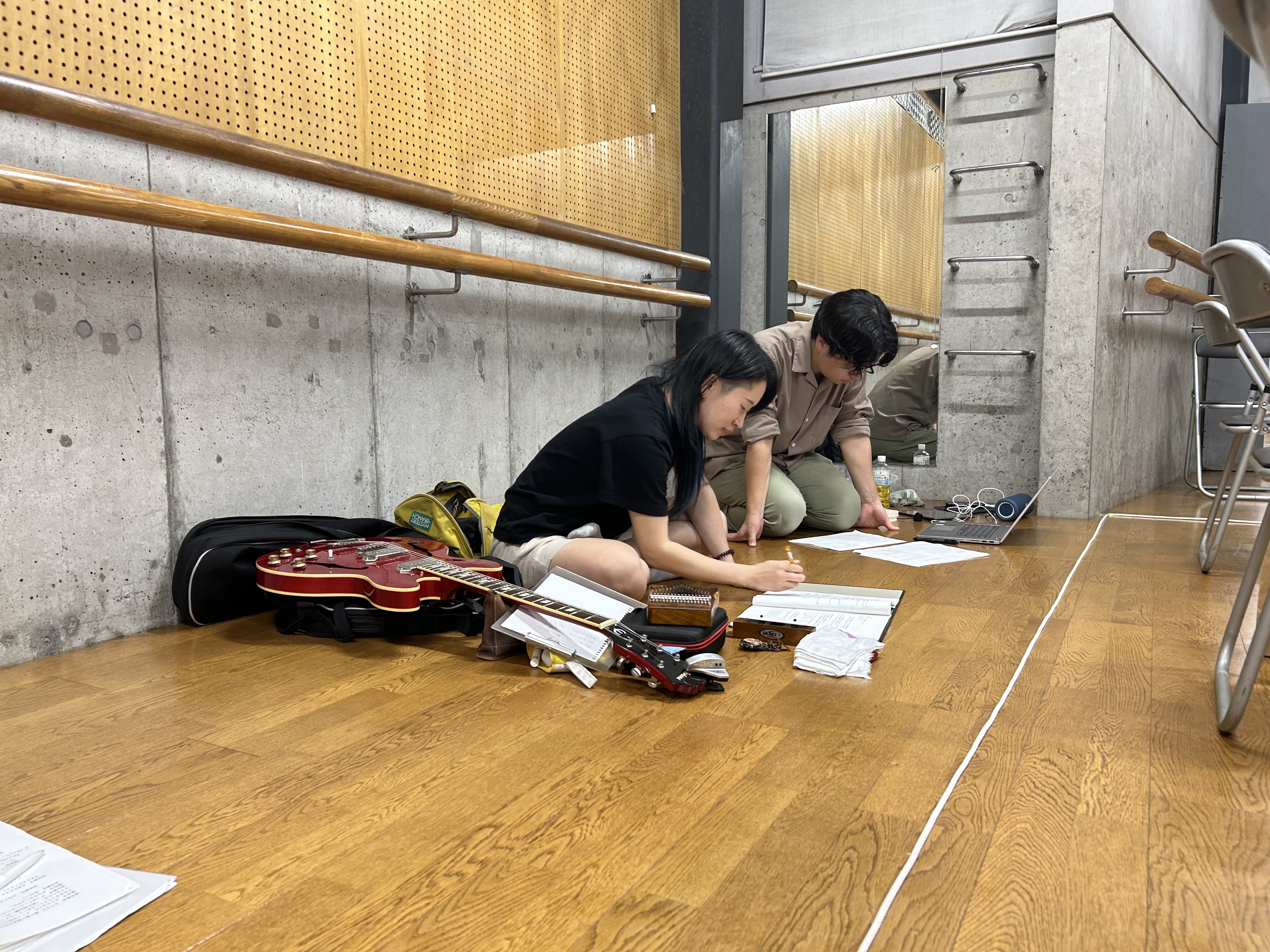 今日の稽古では、「プシュー」という汽車の効果音を生声で出す、というアイディアがあり、できるだけ汽車の大きさや重厚感を感じてもらえるよう、こんな感じの出し方が良いんじゃないか、と説明してらっしゃいました。