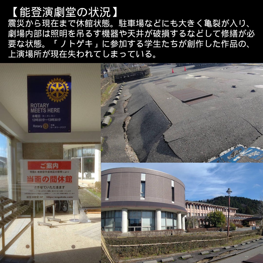 しかし、令和6年能登半島地震によって能登演劇堂は休館状態になり、『ノトゲキ』の開催も断念せざるを得ませんでした。