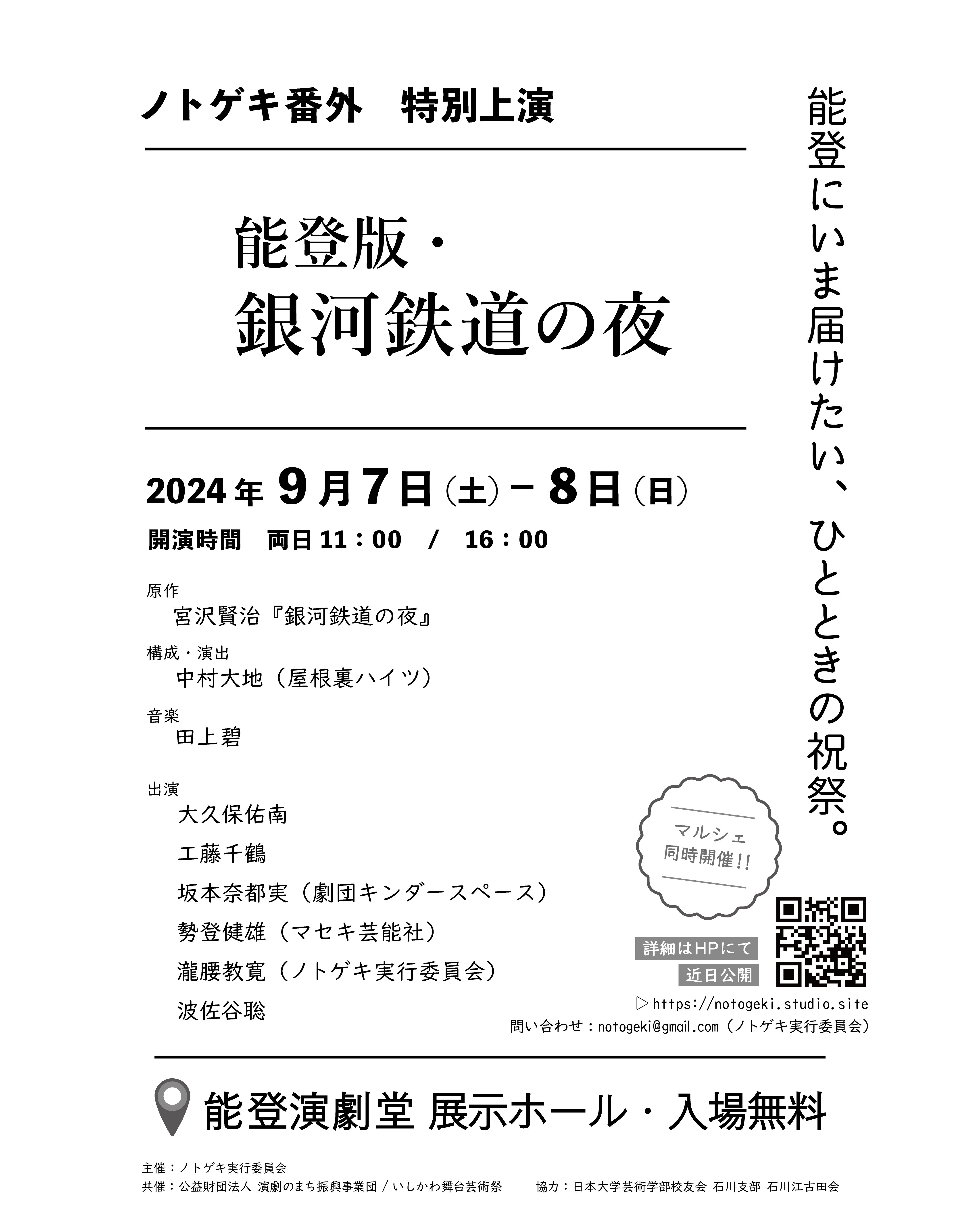 震災以前に、ノトゲキの活動を応援して下さっている演劇関係の方から「〈いしかわ舞台芸術祭2024〉(2024年9月7日~12月21日)を開催する事になったので、ノトゲキもその上演プログラムの一つとして参加してもらえせんか?」と打診されていました。ただ、震災があり今年は大学生の能登滞在制作ができません。〈いしかわ舞台芸術祭2024〉への参加も断念するしかないかと考えましたが、災害ボランティアなどで地元の方々と交流している中、「今こそ演劇の力で地域の人々に少しでも元気を取り戻してもらいたい!」、「自分たちで今できる事を形にして皆様に楽しんで頂きたい!」という想いが高まっていきました。そしてこのプロジェクトを立ち上げ、上演する事を決めました。〈いしかわ舞台芸術祭2024〉の参加プログラムは石川県内各地で予定されていますが、思うように復興の進んでいない能登エリアでは、この「能登版・銀河鉄道の夜」が唯一の舞台上演プログラムとなります。金沢・加賀エリアでは沢山の催し物が企画されますが、能登の方々は距離的にそれらを見に行くことはなかなか難しいと考えています。だからこそ、現地・能登でこの作品をこのタイミングで上演しなければ意味がないと考えています。被災され、大変な苦労をされている能登の皆様に希望と感動を届けたいです。
