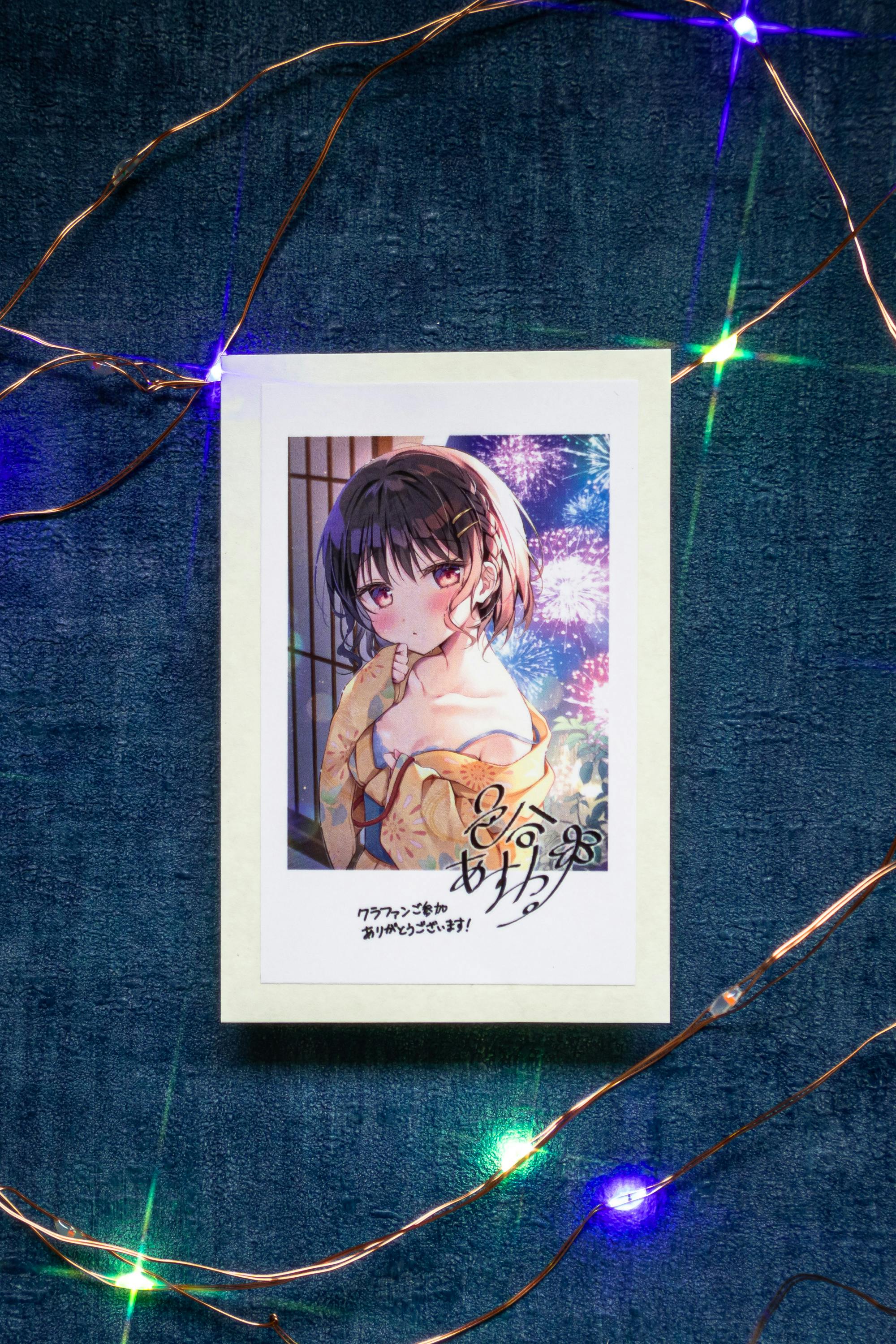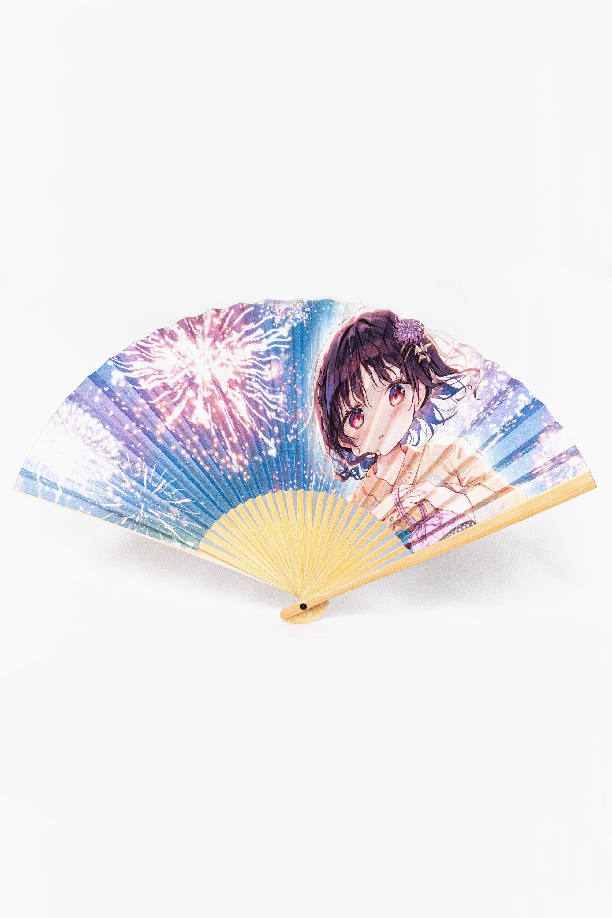 この扇子は、和の美しさと甘酸っぱい青春を融合させたデザインです。夜空に咲く花火と浴衣姿の女の子が、ひと夏の思い出を象徴しています。細部までこだわった色彩と繊細なラインで、夏祭りの一瞬を切り取ったような感動を与えます。