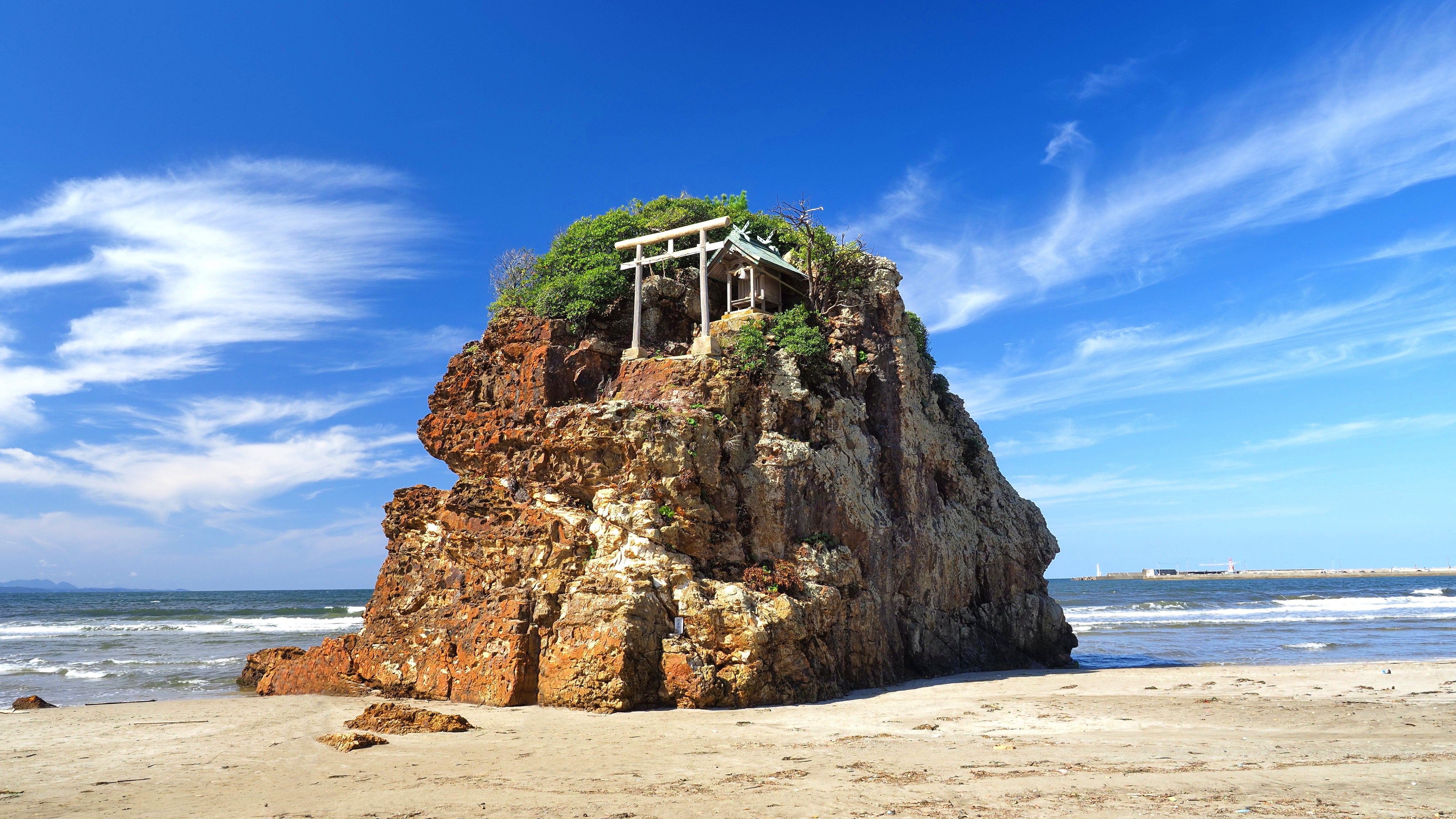 「日本の夕日百選」にも選ばれてる浜にある「弁天島」は、神聖な場所とされ、訪れる人々が祈りを捧げてきました。