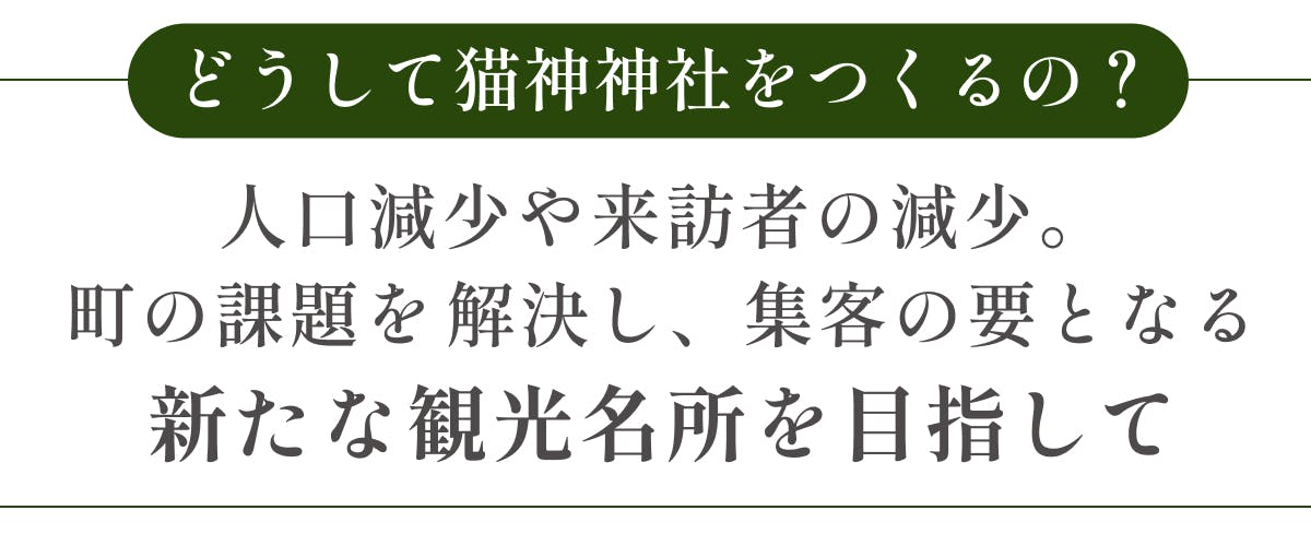 若者が、この町に残りたい!戻りたい!移住したい!と思える基盤づくりが必要であり、そのためには新たなチャレンジをする余地がある!と前向きに捉えました。これまでやってこなかったこと、それが新たな観光スポットとして「猫神神社」を誕生させることです。神社をつくるというキャッチーな取り組みのため、それだけが目的のように感じられる方もいるかもしれませんが、このチャレンジには私たちの丸森町を大切に、そして存続させたいという思いが込められています。
