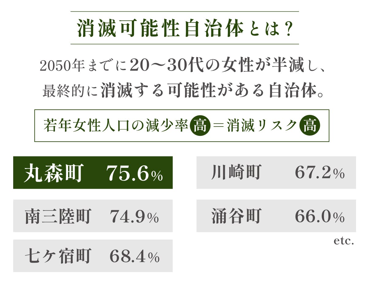 宮城県内で「消滅可能性自治体」と指摘された19の自治体のうち、丸森町は若年女性人口の減少率がマイナス75.6%と県内トップ。若年女性の人口が急減し、最終的には消滅する恐れがあるとされています。