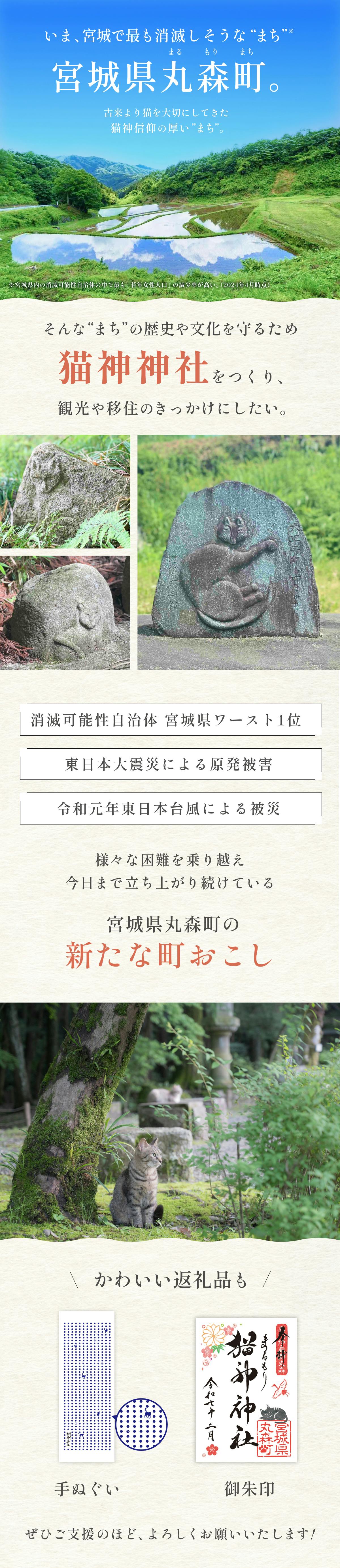 町民をはじめとする多くの人々の力で、度重なる自然災害に負けず、復興への歩みも止めずに前を向き続けている丸森町。この足取りを「元通り」や「かつての姿」で終わらせずに、さらなる発展と持続的で自立した活気ある町となっていくために、観光の要になる新たなスポット「猫神神社」をつくりたいのです。