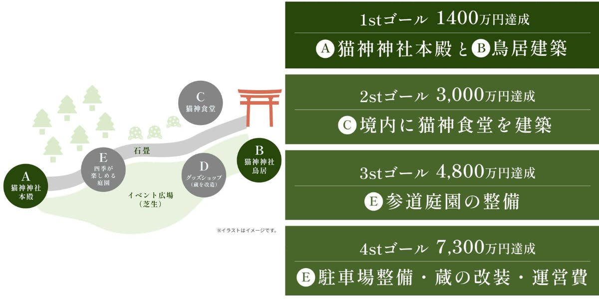 本プロジェクトのご支援は、主に神社をつくる上で必要は費用に充てられますが、集まれば集まるほど、神社境内が完成に近づいていきます。まずは1400万円を達成し、本殿の建築を目指します。