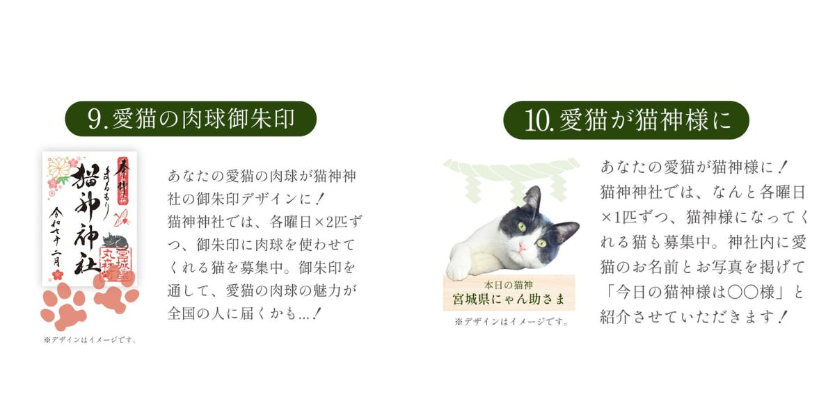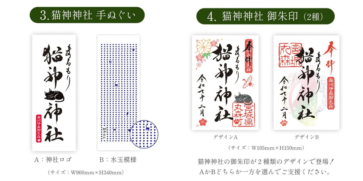 猫神神社の御朱印デザイン(2種)また、通常の御朱印とは別に、高級品である「丸森和紙」で作る猫神神社御朱印もご用意する予定です。通常デザインの御朱印に加えて、毎月22日(にゃんにゃんの日)限定や季節限定のデザインも提供し、地元の方が繰り返し訪れても楽しめる場所を目指しています。