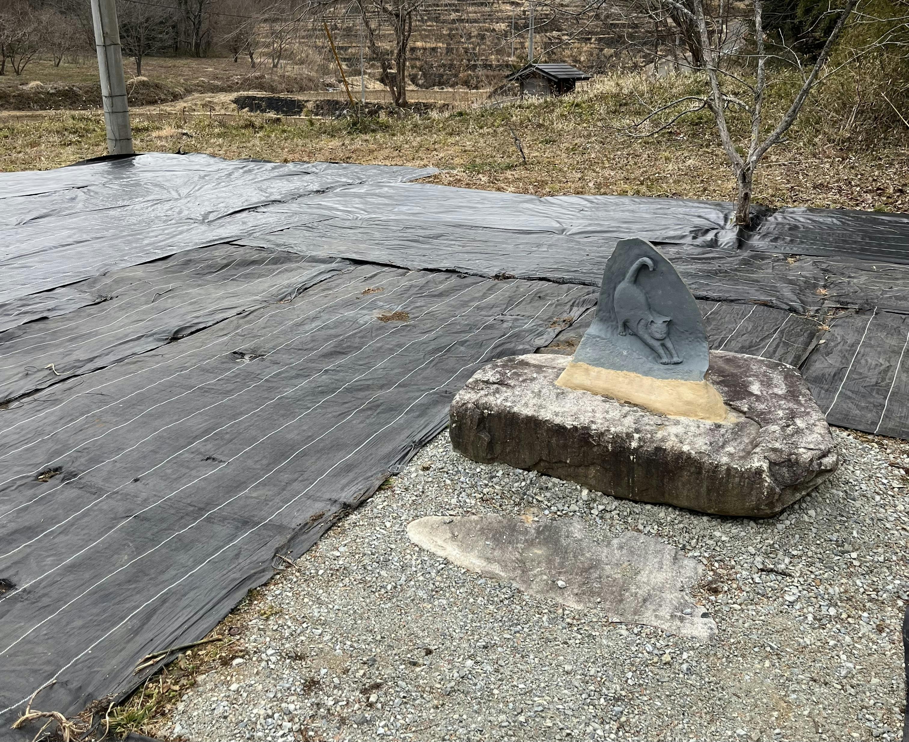 丸森町の猫碑の様子(1)養蚕が盛んだった時代、丸森町では、お蚕様や繭にいたずらするネズミを駆除してくれる「猫」を大切にしていました。そして、猫の石碑を「猫神様」としてあがめる文化がありました。