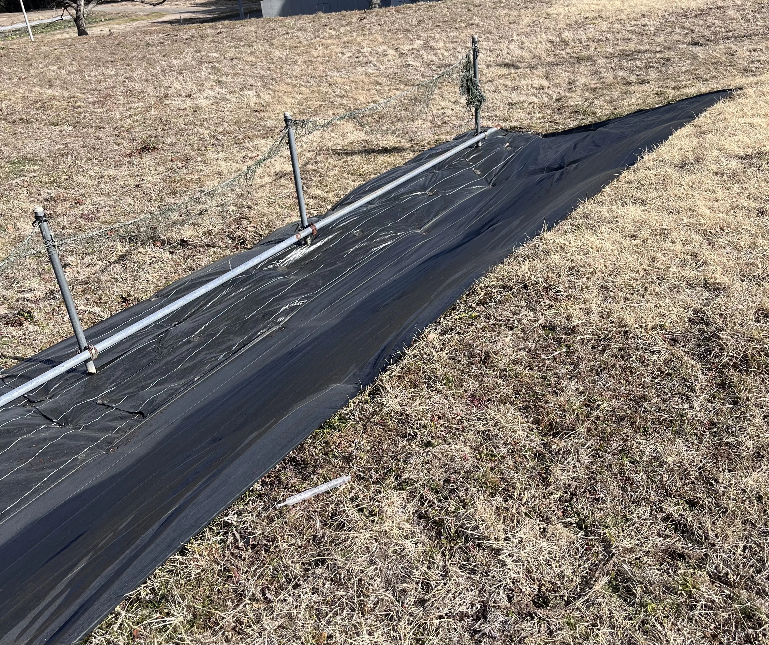 防草シート張り。駐車場側に着手。地味な作業の報告ばかりで申し訳けありません。