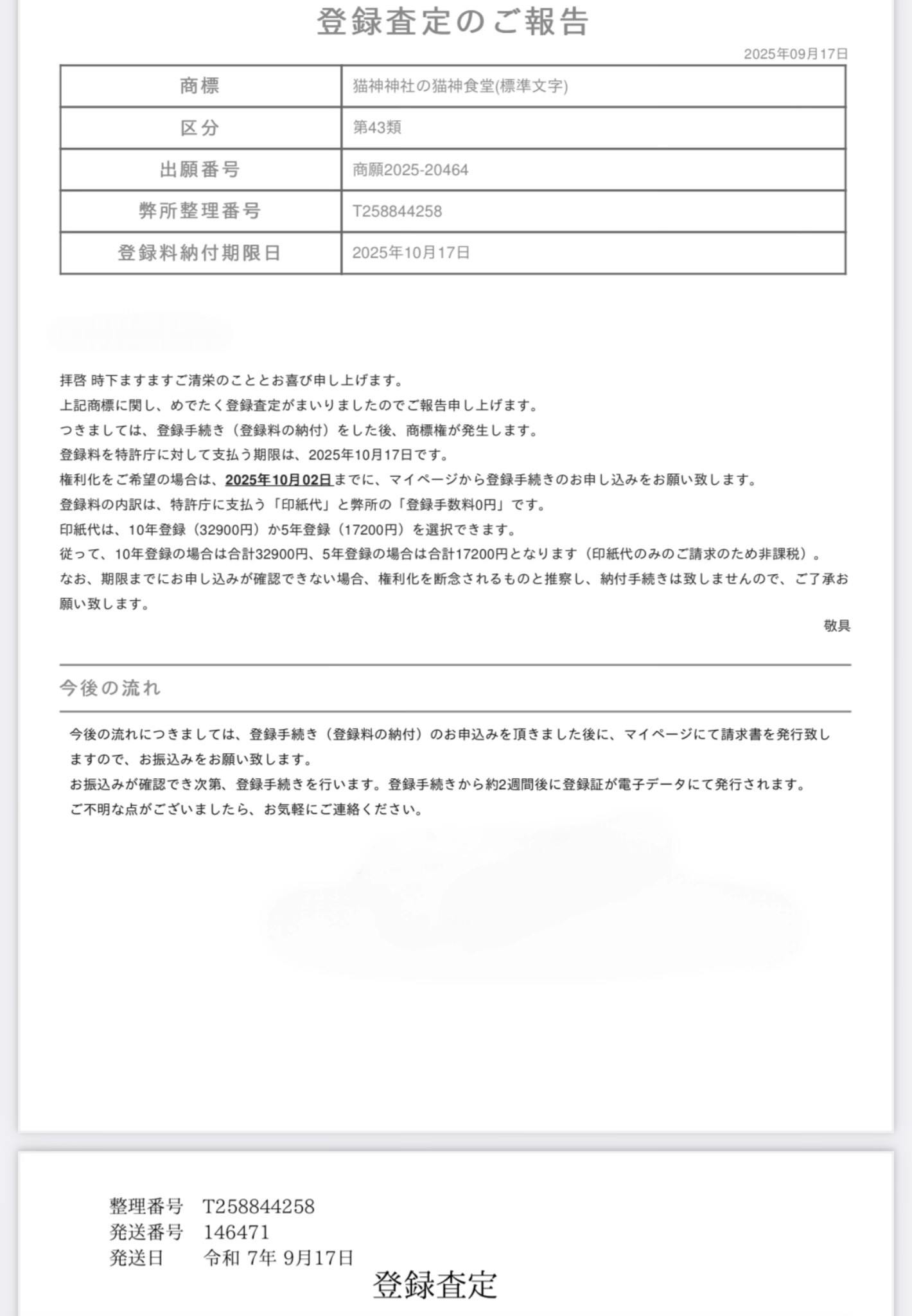 猫神食堂の商標登録も無事通過しました。唯一無二の猫神食堂となります。
