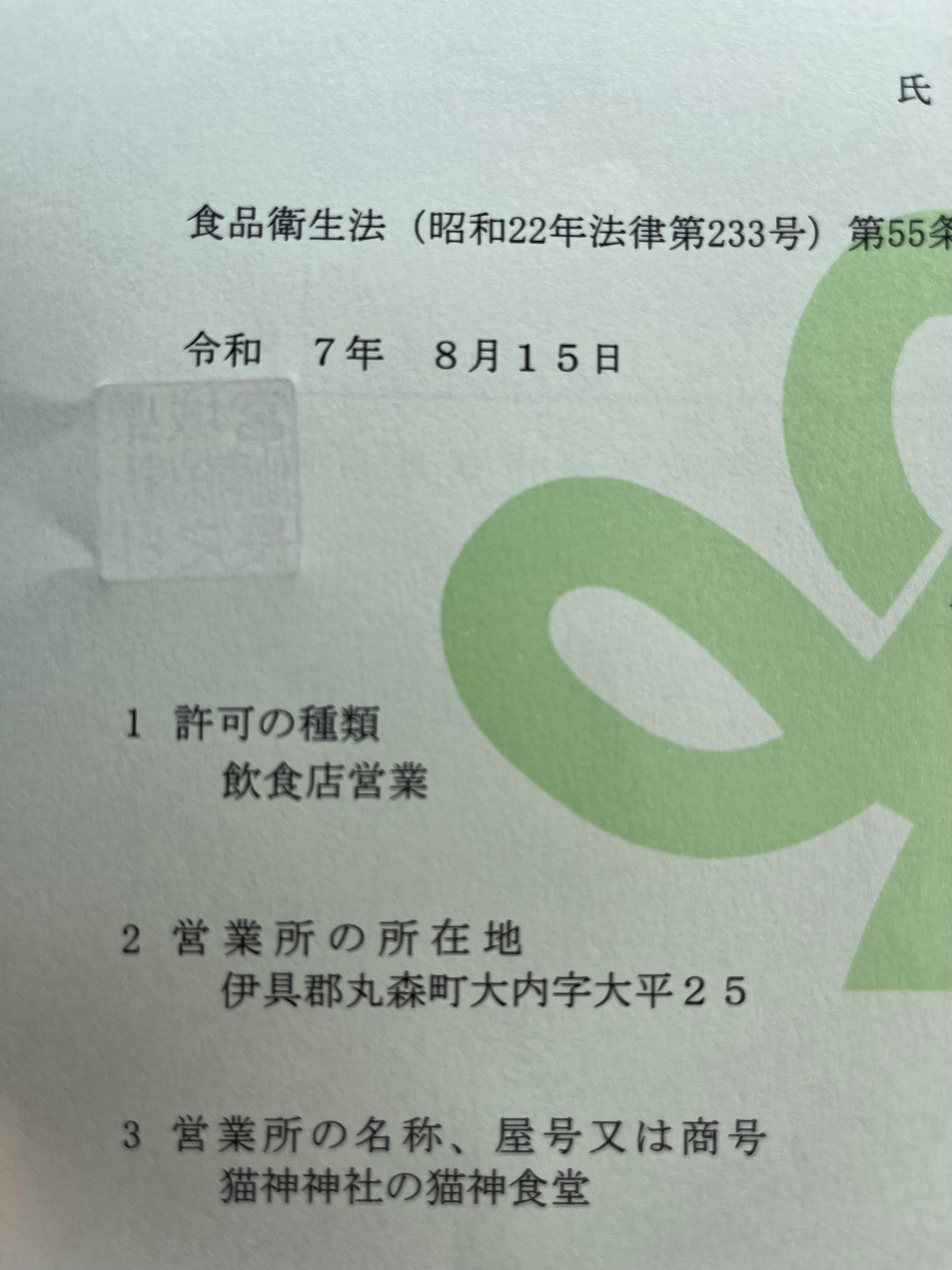 猫神神社の猫神食堂営業許可書が発行され本日保健所にとりに来ました。これで、いつでもオープンできる状態となりました。クラファン第二弾も後わずが。引き続きのご支援を、よろしくお願い致します。猫神神社建立プロジェクト クラファンはこちらをタップ