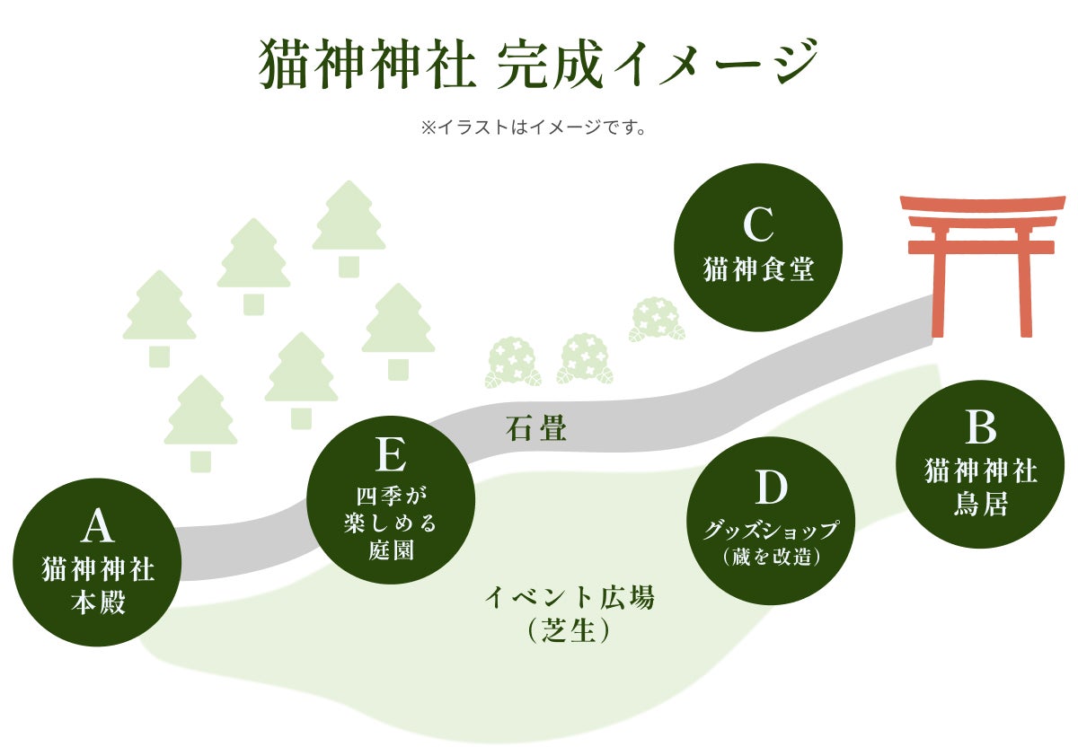 まずは何よりも大事な猫神神社の本殿を建築。ここでは、愛猫の健康祈願をはじめとする猫神様への参拝ができます。