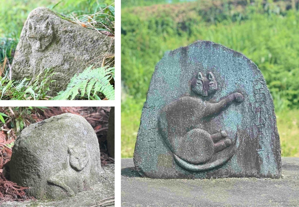 丸森町の猫碑の様子(1)養蚕が盛んだった時代、丸森町では、お蚕様や繭にいたずらするネズミを駆除してくれる「猫」を大切にしていました。そして、猫の石碑を「猫神様」としてあがめる文化がありました。
