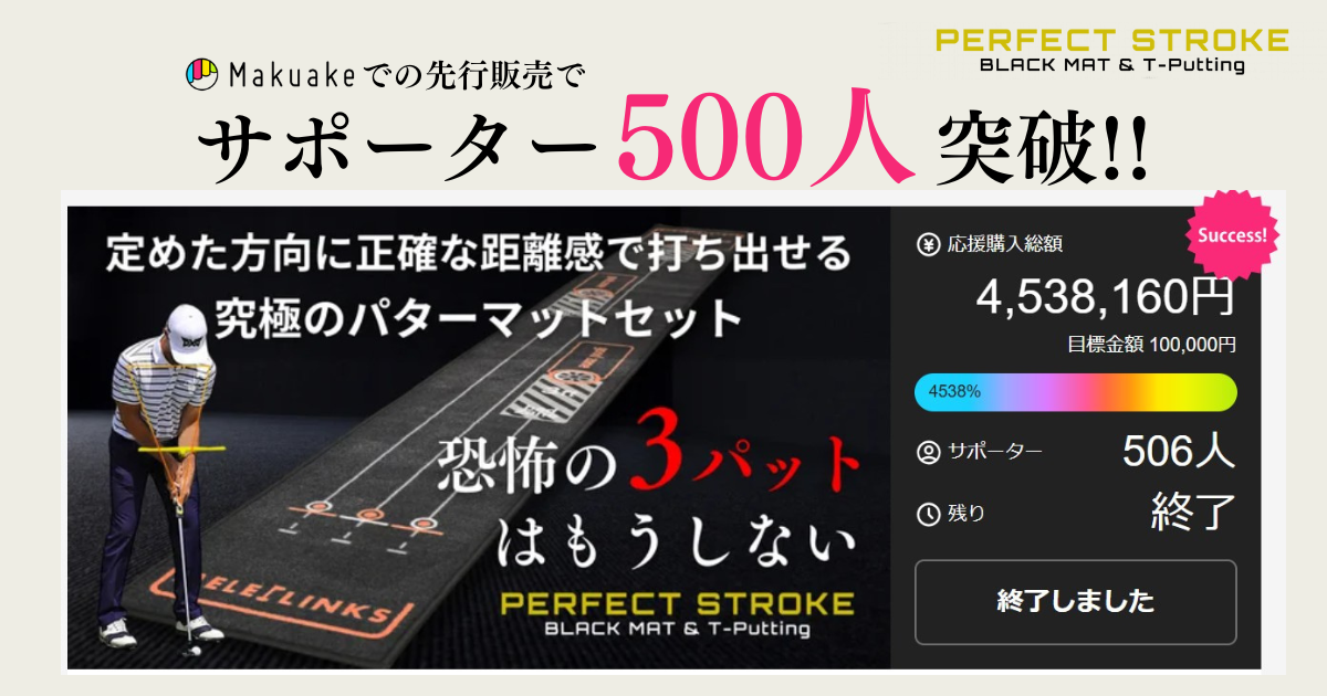 2025/04/01 10:56「CAMPFIRE」でのプロジェクトが昨日をもって終了いたしました。今回は約40日間というプロジェクト期間でしたが120人を超える方にご支援いただき、3回にわたるクラウドファンディングで延べ約900人のサポーターの方々にご購入いただきました。多くの反響をいただきスタッフ一同、心から感激しております。本当にありがとうございます!今回ご紹介しました「PERFECT STROKE ブラックマット & ティーパッティング」は、プロゴルファーの意見を参考にしながら、最適なサイズ、デザイン、素材を研究して作り上げた、これ以上ないともいえるパッティングの練習アイテムです。弊社も開発段階から製品の取り扱いに向けてモニターを行ってきましたが、モニターに参加した全員がパッティングの技術向上を実感することができました。またプロジェクトの過程の中でも多くのプロゴルファー、プロコーチからもご推薦のお言葉をいただき、Yahoo!ニュースにまで取り上げていただくことができました。「PERFECT STROKE ブラックマット&ティーパッティング」を使用して練習に取り組んでいただいた全てのゴルファーの方のパッティング技術向上を願っております。生産の方は既に開始いたしております。現時点の予定にはなりますが、5月中旬には生産が完了し、5月下旬の発送に向けて進めております。1日も早くお手元に届けられますよう引き続き工場と連携しながら準備を進めて参ります。お届けまで少しお時間を頂戴しますが、楽しみにお待ちいただけましたらと思います。「PERFECT STROKE」はゴルフのスキルアップを目指すブランドとして、これからもお役に立てる練習用品をシリーズ化し開発していく所存です。最初の商品となった「ブラックマット & ティーパッティング」を応援購入いただいた皆様には感謝しかございません。またCAMPFIREにてご案内できることを目指しながら、「PERFECT STROKE」シリーズの今後の展開にも注目していただけたらと思います。本当にありがとうございました! もっと見る