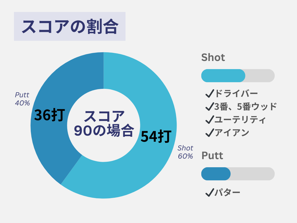 スコアを作る上で60%を占めるショットはドライバーから始まりショートアイアンまで様々なクラブを使うのに対し、残りの40%はパター1本だけで36打打っているのです。