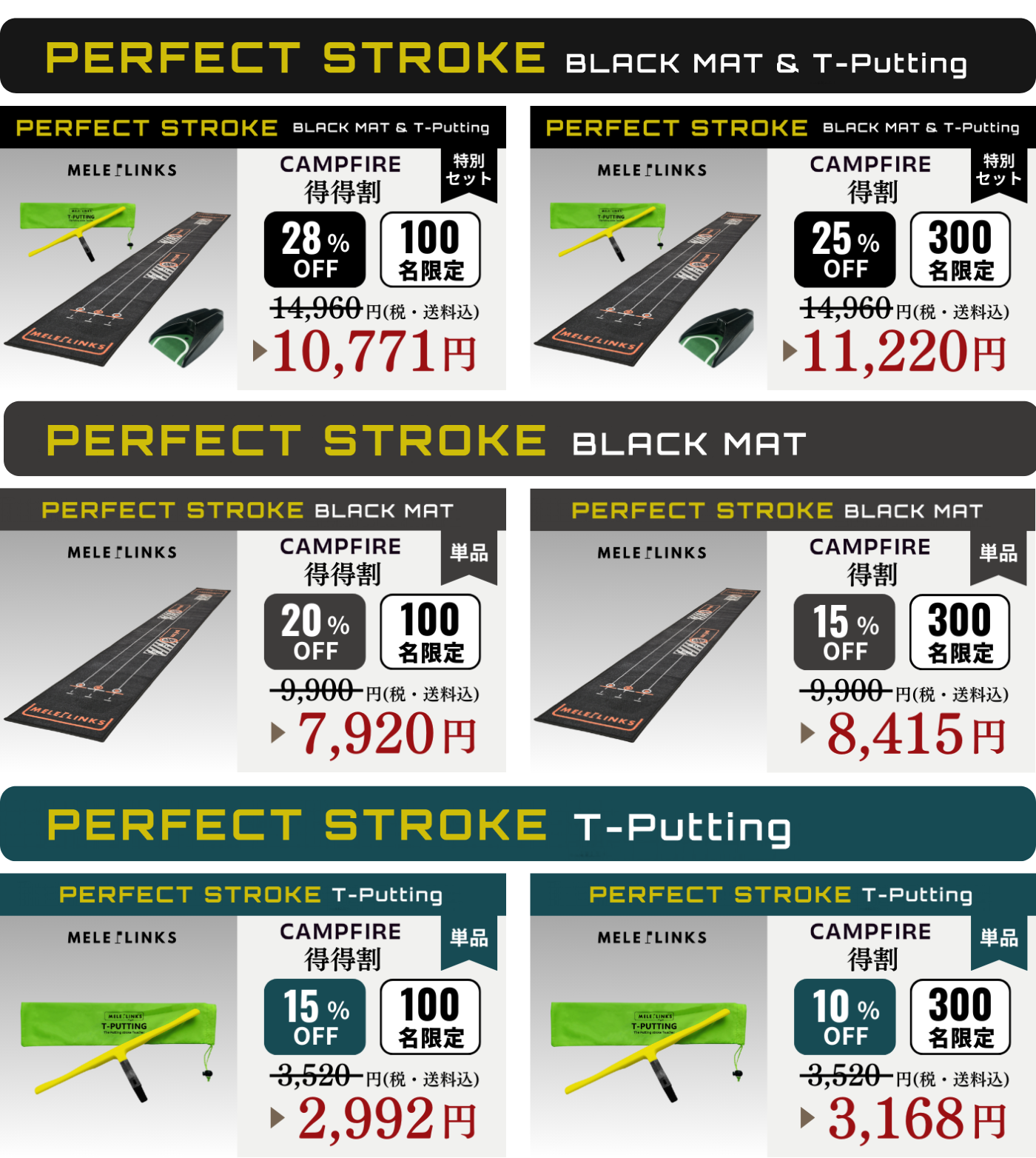 今回、「パーフェクトストローク ブラックマット&ティーパッティング」、「ブラックマット 単品」、「ティーパッティング 単品」の3種類のリターンをご用意しました。