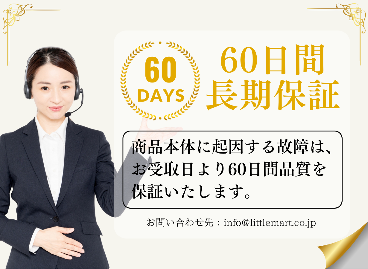 アフターサービスも充実。商品本体に起因する故障、不具合はお受取日より60日間の保証付きとなります。